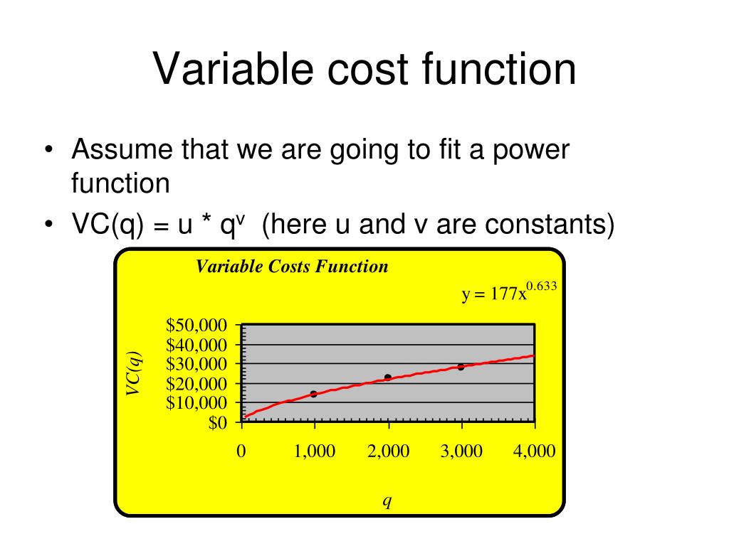 Variable cost function • Assume that we are going to fit a power function • VC(q) = u * qv (here u and v are constants)
