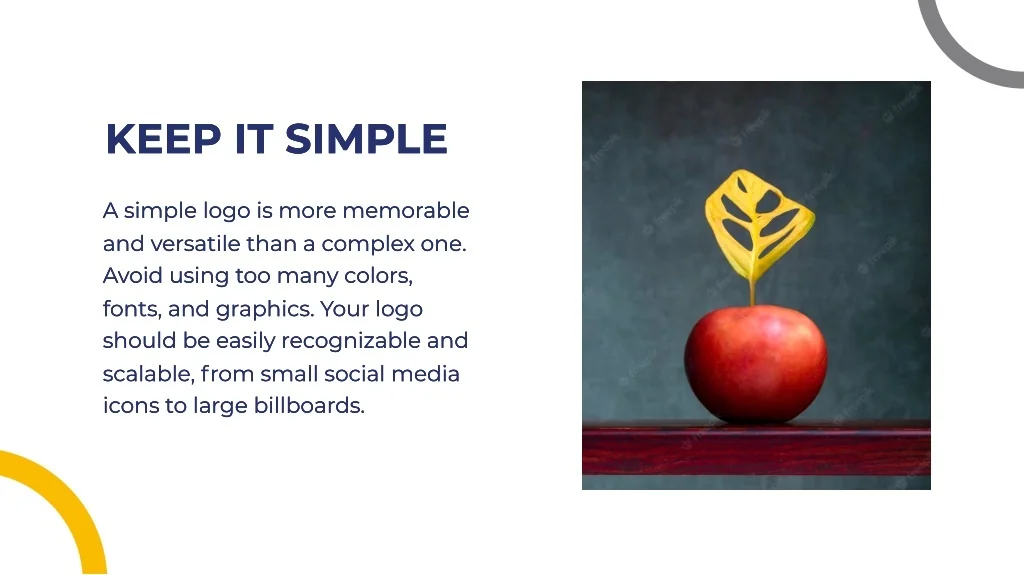 KEEP IT SIMPLE KEEP IT SIMPLE KEEP IT SIMPLE A simple logo is more memorable and versatile than a complex one. Avoid using too many colors, fonts, and graphics. Your logo should be easily recognizable and scalable, from small social media icons to large billboards. icons to large billboards. icons to large billboards. A simple logo is more memorable and versatile than a complex one. Avoid using too many colors, fonts, and graphics. Your logo should be easily recognizable and scalable, from small social media scalable, from small social media A simple logo is more memorable and versatile than a complex one. Avoid using too many colors, fonts, and graphics. Your logo should be easily recognizable and