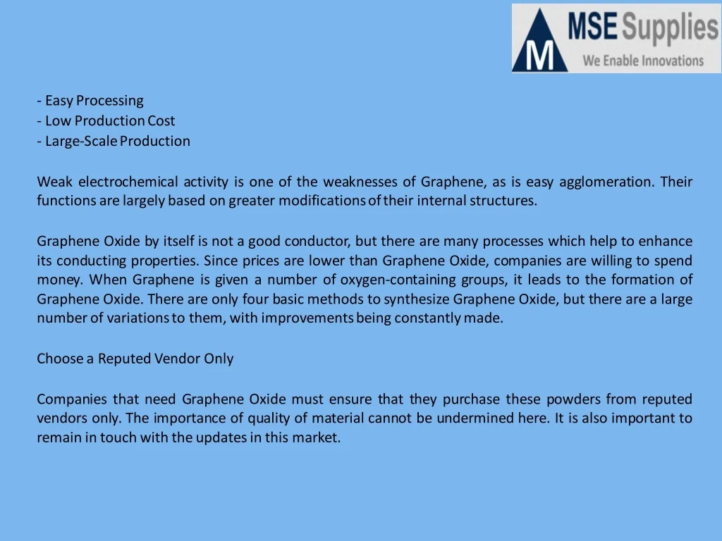 - Easy Processing - Low Production Cost - Large-Scale Production Weak electrochemical activity is one of the weaknesses of Graphene, as is easy agglomeration. Their functions are largely based on greater modifications of their internal structures. Graphene Oxide by itself is not a good conductor, but there are many processes which help to enhance its conducting properties. Since prices are lower than Graphene Oxide, companies are willing to spend money. When Graphene is given a number of oxygen-containing groups, it leads to the formation of Graphene Oxide. There are only four basic methods to synthesize Graphene Oxide, but there are a large number of variations to them, with improvements being constantly made. Choose a Reputed Vendor Only Companies that need Graphene Oxide must ensure that they purchase these powders from reputed vendors only. The importance of quality of material cannot be undermined here. It is also important to remain in touch with the updates in this market.