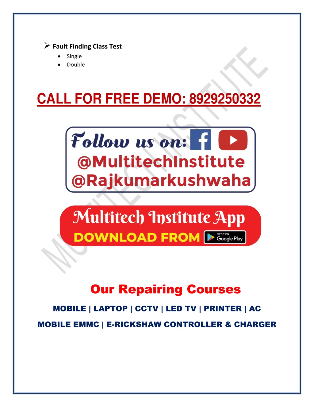 7. ➢Fault Finding Class Test •Single •Double CALL FOR FREE DEMO: 8929250332 Our Repairing Courses MOBILE | LAPTOP | CCTV | LED TV | PRINTER | AC MOBILE EMMC | E-RICKSHAW CONTROLLER & CHARGER
