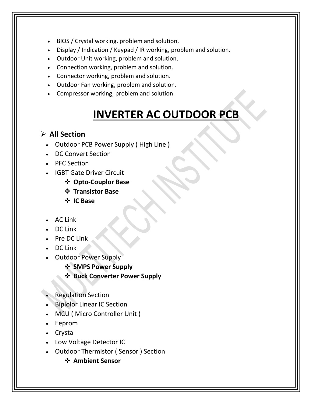 •BIOS / Crystal working, problem and solution. •Display / Indication / Keypad / IR working, problem and solution. •Outdoor Unit working, problem and solution. •Connection working, problem and solution. •Connector working, problem and solution. •Outdoor Fan working, problem and solution. •Compressor working, problem and solution. INVERTER AC OUTDOOR PCB ➢All Section •Outdoor PCB Power Supply ( High Line ) •DC Convert Section •PFC Section •IGBT Gate Driver Circuit ❖Opto-Couplor Base ❖Transistor Base ❖IC Base •AC Link •DC Link •Pre DC Link •DC Link •Outdoor Power Supply ❖SMPS Power Supply ❖Buck Converter Power Supply •Regulation Section •Biplolor Linear IC Section •MCU ( Micro Controller Unit ) •Eeprom •Crystal •Low Voltage Detector IC •Outdoor Thermistor ( Sensor ) Section ❖Ambient Sensor