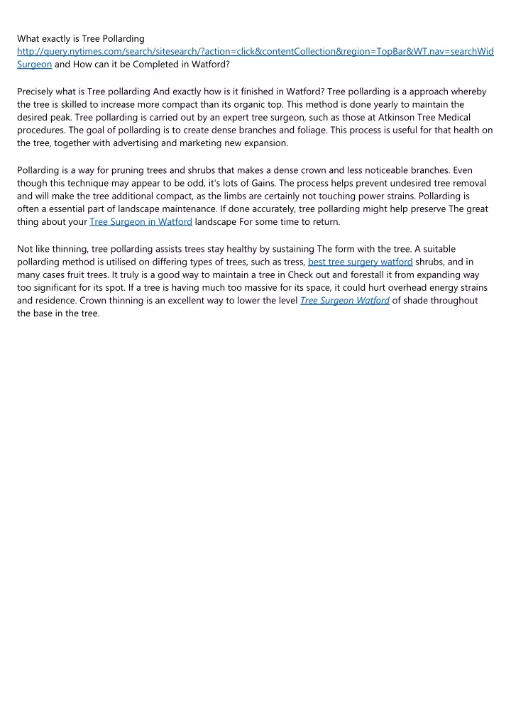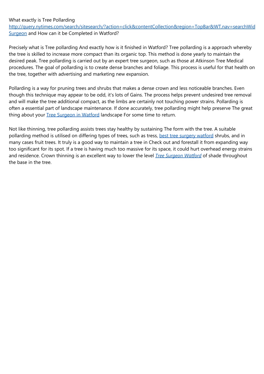 What exactly is Tree Pollarding http://query.nytimes.com/search/sitesearch/?action=click&contentCollection®ion=TopBar&WT.nav=searchWidget&module=SearchSubmit&pgtype=Homepage#/Tree Surgeon and How can it be Completed in Watford? Precisely what is Tree pollarding And exactly how is it finished in Watford? Tree pollarding is a approach whereby the tree is skilled to increase more compact than its organic top. This method is done yearly to maintain the desired peak. Tree pollarding is carried out by an expert tree surgeon, such as those at Atkinson Tree Medical procedures. The goal of pollarding is to create dense branches and foliage. This process is useful for that health on the tree, together with advertising and marketing new expansion. Pollarding is a way for pruning trees and shrubs that makes a dense crown and less noticeable branches. Even though this technique may appear to be odd, it's lots of Gains. The process helps prevent undesired tree removal and will make the tree additional compact, as the limbs are certainly not touching power strains. Pollarding is often a essential part of landscape maintenance. If done accurately, tree pollarding might help preserve The great thing about your Tree Surgeon in Watford landscape For some time to return. Not like thinning, tree pollarding assists trees stay healthy by sustaining The form with the tree. A suitable pollarding method is utilised on differing types of trees, such as tress, best tree surgery watford shrubs, and in many cases fruit trees. It truly is a good way to maintain a tree in Check out and forestall it from expanding way too significant for its spot. If a tree is having much too massive for its space, it could hurt overhead energy strains and residence. Crown thinning is an excellent way to lower the level Tree Surgeon Watford of shade throughout the base in the tree.