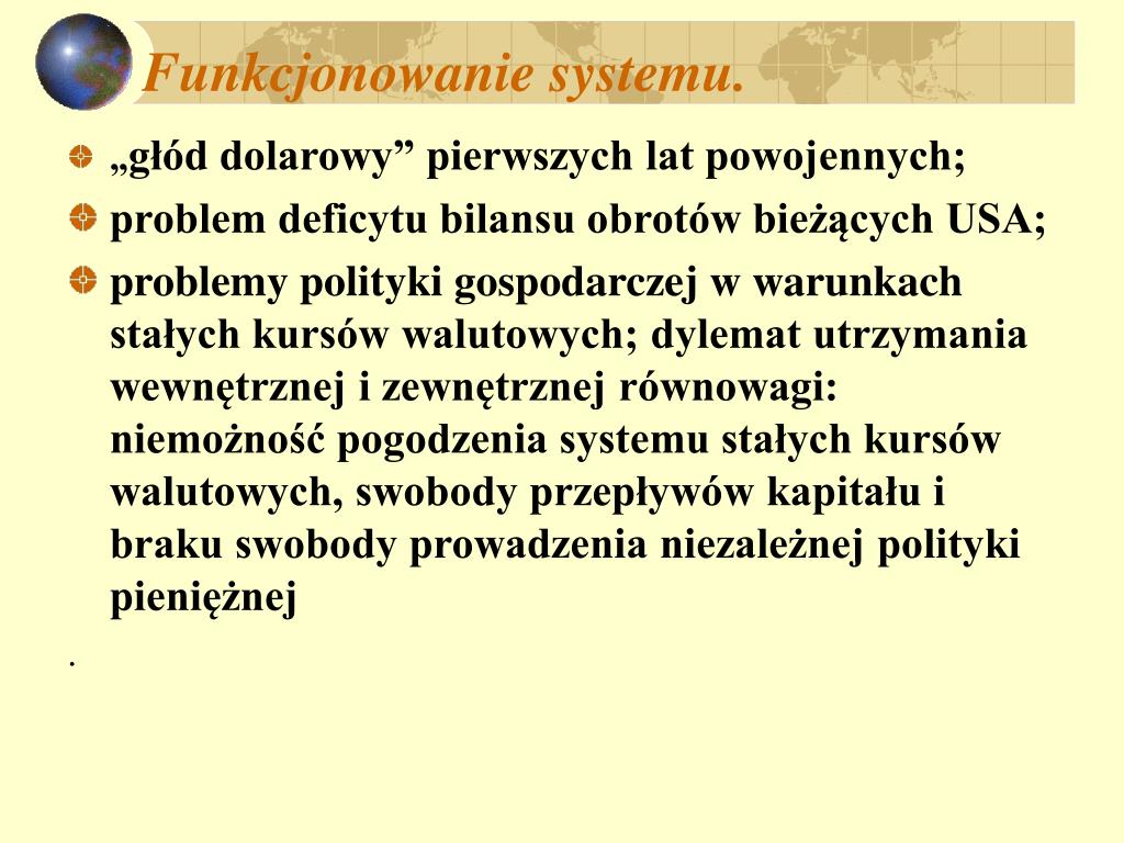 Funkcjonowanie systemu. • „głód dolarowy” pierwszych lat powojennych; • problem deficytu bilansu obrotów bieżących USA; • problemy polityki gospodarczej w warunkach stałych kursów walutowych; dylemat utrzymania wewnętrznej i zewnętrznej równowagi: niemożność pogodzenia systemu stałych kursów walutowych, swobody przepływów kapitału i braku swobody prowadzenia niezależnej polityki pieniężnej .