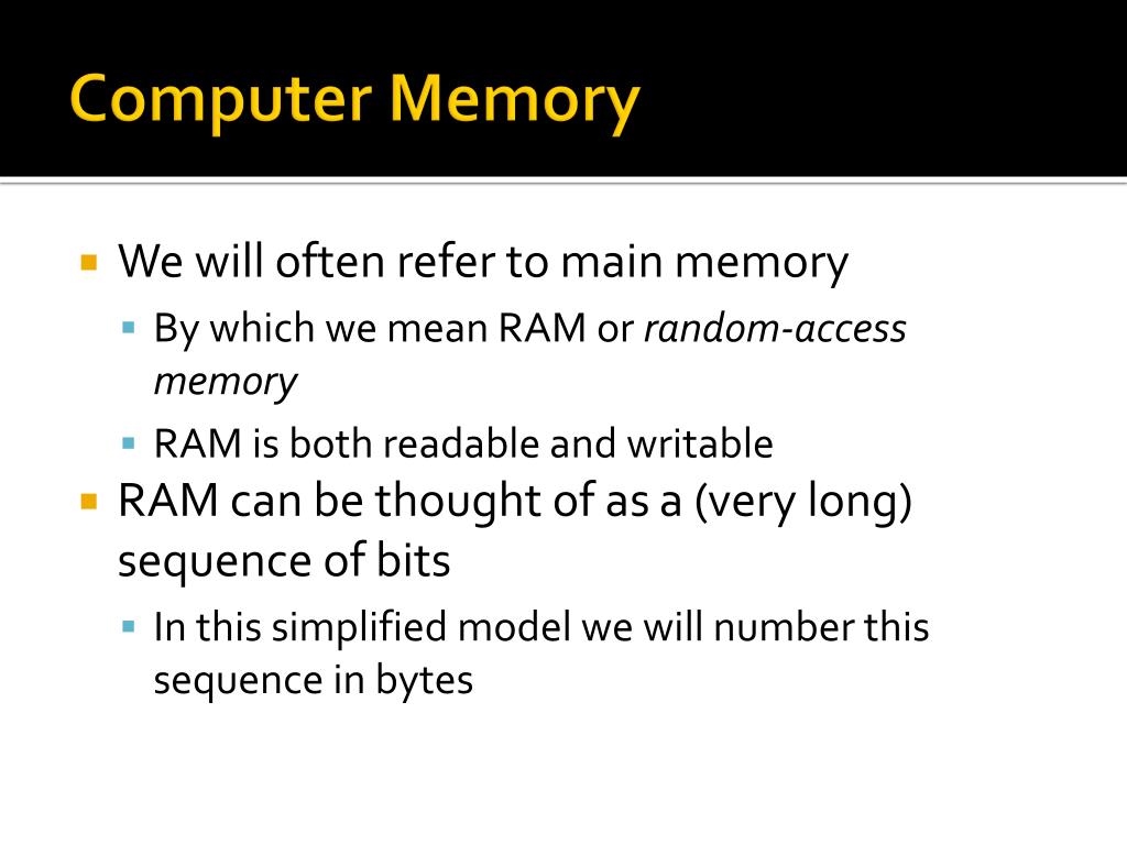 Computer Memory • We will often refer to main memory • By which we mean RAM or random-access memory • RAM is both readable and writable • RAM can be thought of as a (very long) sequence of bits • In this simplified model we will number this sequence in bytes