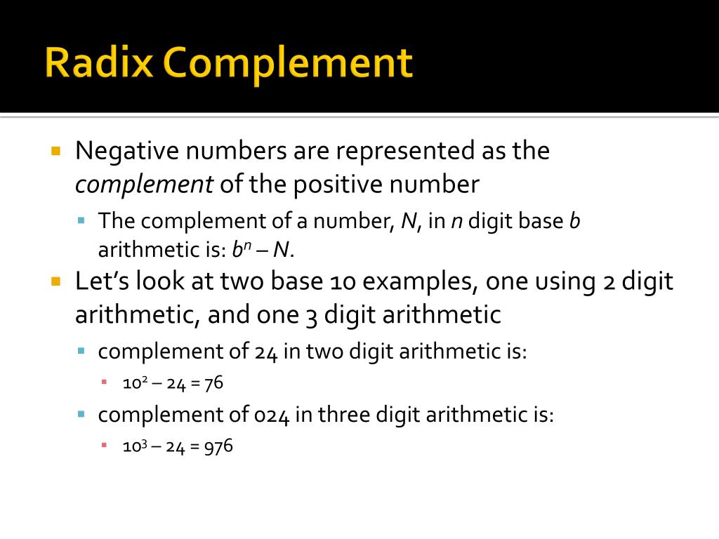Radix Complement • Negative numbers are represented as the complement of the positive number • The complement of a number, N, in n digit base b arithmetic is: bn – N. • Let’s look at two base 10 examples, one using 2 digit arithmetic, and one 3 digit arithmetic • complement of 24 in two digit arithmetic is: • 102 – 24 = 76 • complement of 024 in three digit arithmetic is: • 103 – 24 = 976