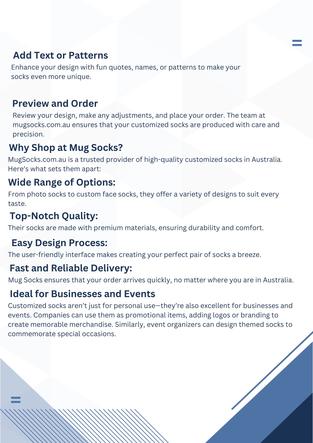 Add Text or Patterns Enhance your design with fun quotes, names, or patterns to make your socks even more unique. Preview and Order Review your design, make any adjustments, and place your order. The team at mugsocks.com.au ensures that your customized socks are produced with care and precision. Why Shop at Mug Socks? MugSocks.com.au is a trusted provider of high-quality customized socks in Australia. Here’s what sets them apart: Wide Range of Options: From photo socks to custom face socks, they offer a variety of designs to suit every taste. Top-Notch Quality: Their socks are made with premium materials, ensuring durability and comfort. Easy Design Process: The user-friendly interface makes creating your perfect pair of socks a breeze. Fast and Reliable Delivery: Mug Socks ensures that your order arrives quickly, no matter where you are in Australia. Ideal for Businesses and Events Customized socks aren’t just for personal use—they’re also excellent for businesses and events. Companies can use them as promotional items, adding logos or branding to create memorable merchandise. Similarly, event organizers can design themed socks to commemorate special occasions.