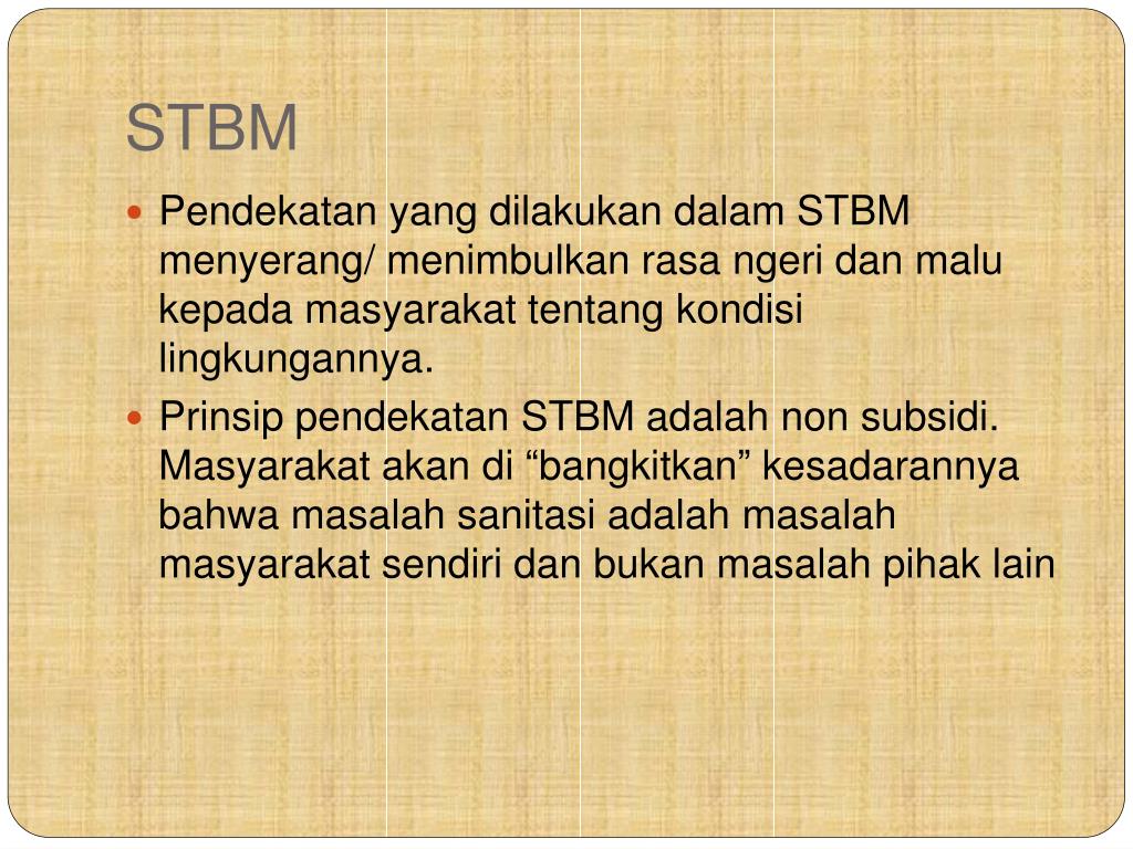 STBM • Pendekatanyang dilakukandalam STBM menyerang/ menimbulkan rasa ngeridanmalukepadamasyarakattentangkondisilingkungannya. • Prinsippendekatan STBM adalah non subsidi. Masyarakatakandi “bangkitkan” kesadarannyabahwamasalahsanitasiadalahmasalahmasyarakatsendiridanbukanmasalahpihak lain