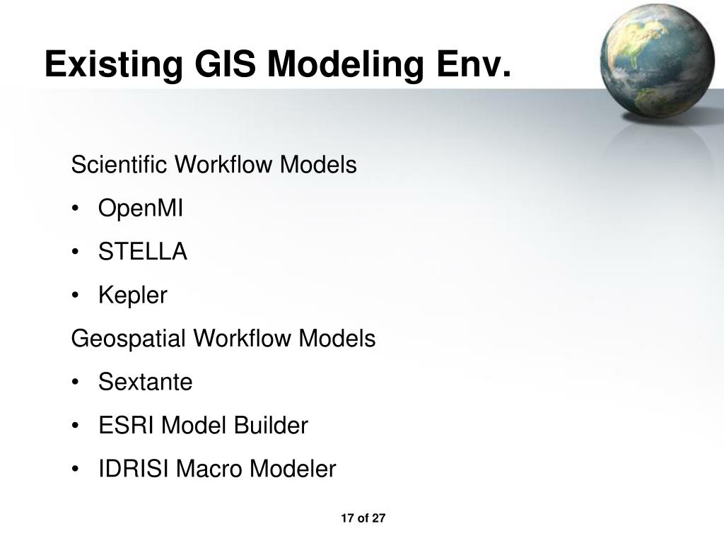 Existing GIS Modeling Env. • Scientific Workflow Models • OpenMI • STELLA • Kepler • Geospatial Workflow Models • Sextante • ESRI Model Builder • IDRISI Macro Modeler