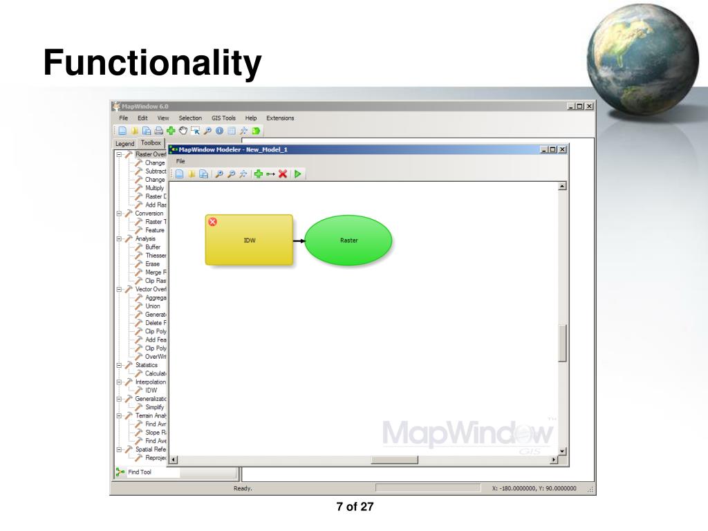 MapWindow 6.0 Modeler By: Brian Marchionni (Presented by Ted Dunsford). Idaho State University September 2009. Brian Marchionni. From Montreal Canada B.S. Computer Science M.S. GIS at ISU. Graduated!. Design Structure. MapWindow Modeler Architecture. MapWindow 6 Architecture.