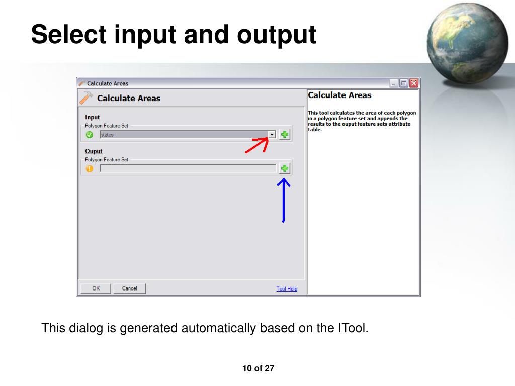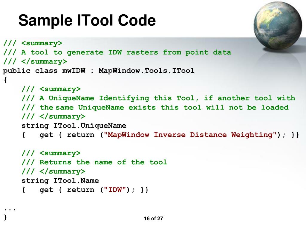 Sample ITool Code /// <summary> /// A tool to generate IDW rasters from point data /// </summary> public class mwIDW : MapWindow.Tools.ITool { /// <summary> /// A UniqueName Identifying this Tool, if another tool with /// thesame UniqueName exists this tool will not be loaded /// </summary> string ITool.UniqueName { get { return ("MapWindow Inverse Distance Weighting"); }} /// <summary> /// Returns the name of the tool /// </summary> string ITool.Name { get { return ("IDW"); }} ... }