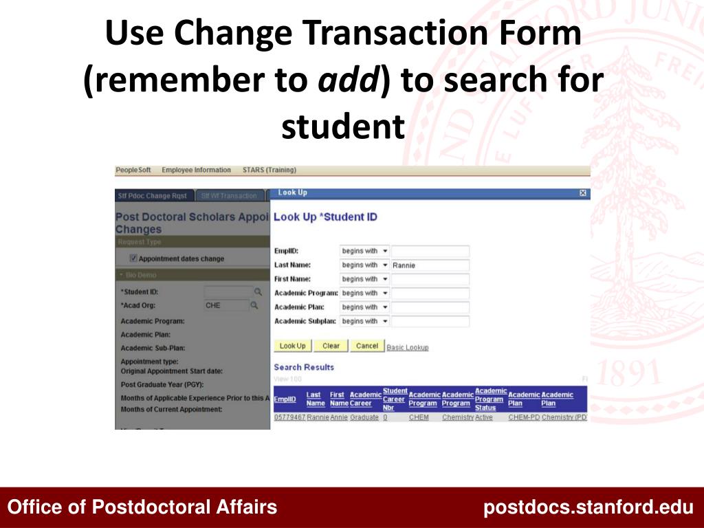 Update • Project website: http://postdocs.stanford.edu/admin/PeopleSoft_Project.html • Training slides are up-to-date with “Tips and Tricks” slids added • Open Labs & Trainings on the website • “Policies & Procedures” Training – need to attend an upcoming session if you are new to postdoc administration