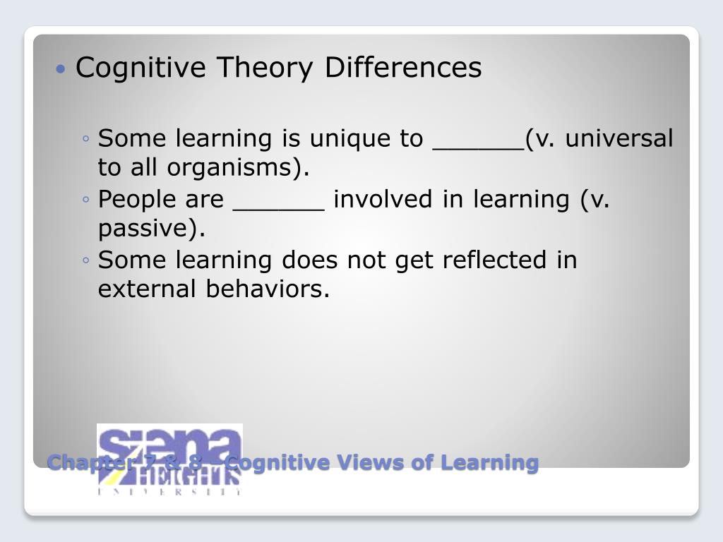 Cognitive Theory Differences • Some learning is unique to ______(v. universal to all organisms). • People are ______ involved in learning (v. passive). • Some learning does not get reflected in external behaviors. Chapter 7 & 8 –Cognitive Views of Learning
