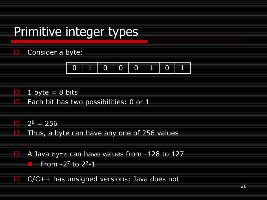 Primitive integer types • Consider a byte: • 1 byte = 8 bits • Each bit has two possibilities: 0 or 1 • 28 = 256 • Thus, a byte can have any one of 256 values • A Java byte can have values from -128 to 127 • From -27 to 27-1 • C/C++ has unsigned versions; Java does not