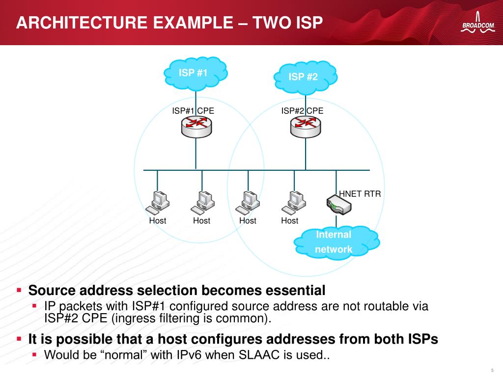 Architecture example – two isp one cpe ISP #1 ISP #2 “Content” services accessible only via ISP#2.. (TV etc.. CPE CPE provides “aggregate” of configuration information.. HNET RTR Host Host Host Host Internal network • Source address selection “complexity” in a different form • IP packets with ISP#1 configured source address are not routable via ISP#2 CPE (ingress filtering is common). • End hosts see only one CPE and source for addressing.. However.. only certain range of source addresses can be used to reach e.g. ISP#2 services..