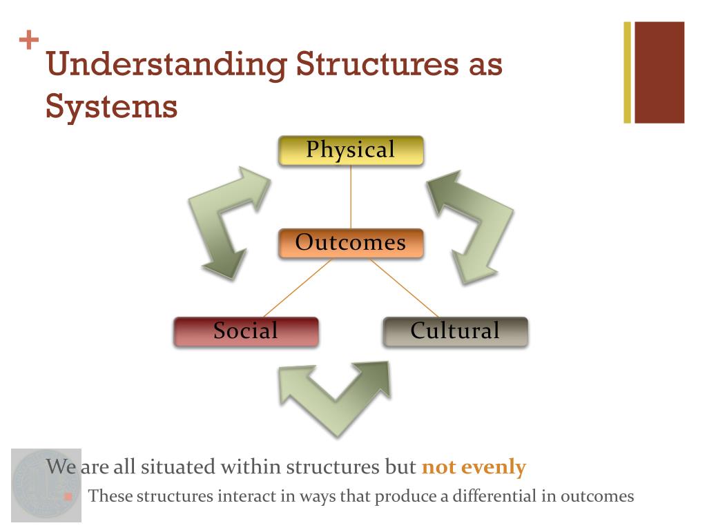 Understanding Structures as Systems We are all situated within structures but not evenly • These structures interact in ways that produce a differential in outcomes
