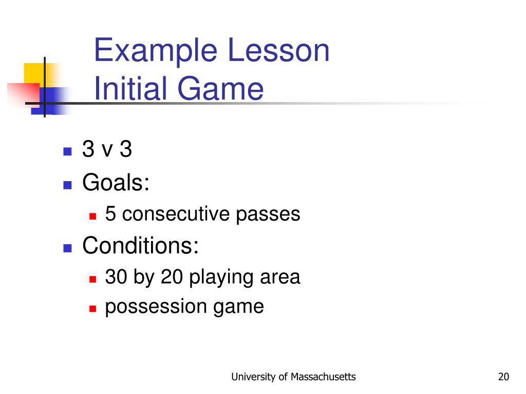 Example LessonInitial Game • 3 v 3 • Goals: • 5 consecutive passes • Conditions: • 30 by 20 playing area • possession game University of Massachusetts