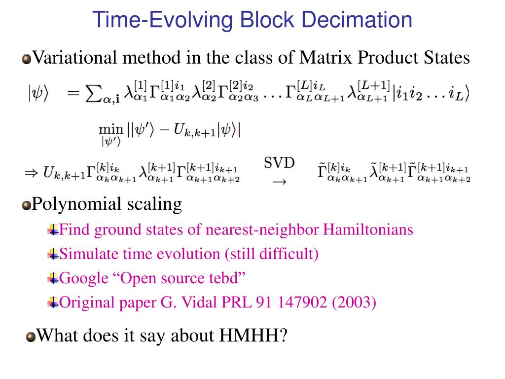 Time-Evolving Block Decimation • Variational method in the class of Matrix Product States • Polynomial scaling • Find ground states of nearest-neighbor Hamiltonians • Simulate time evolution (still difficult) • Google “Open source tebd” • Original paper G. Vidal PRL 91 147902 (2003) • What does it say about HMHH?