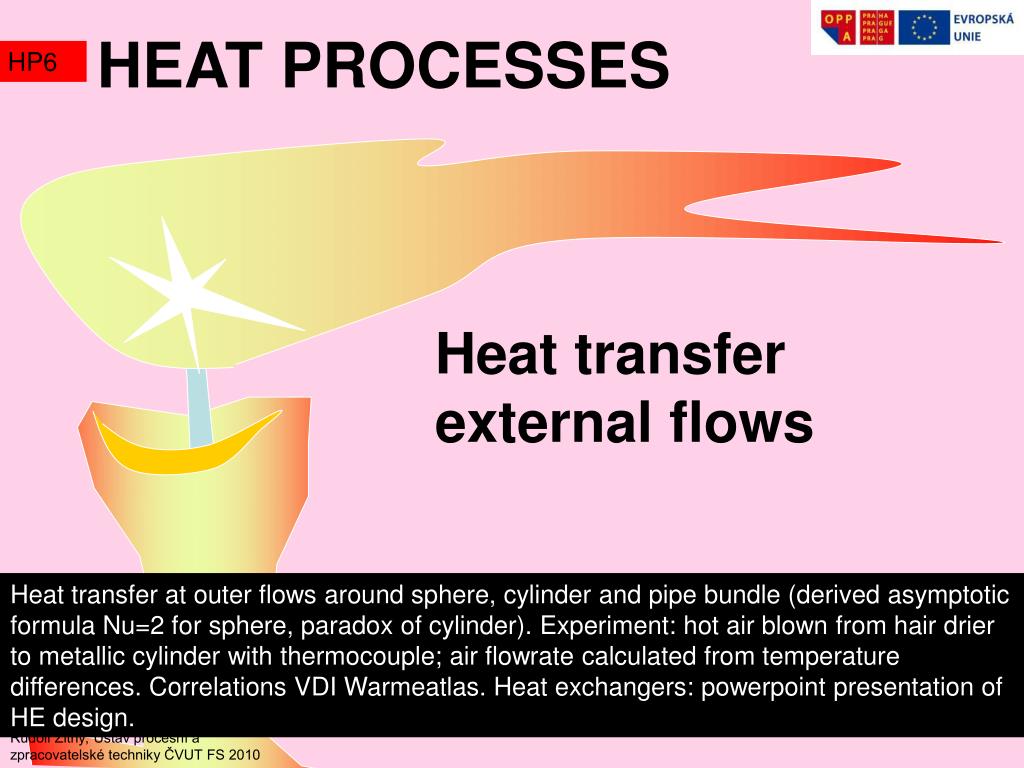 HEAT PROCESSES HP6 Heat transfer external flows Heat transfer at outer flows around sphere, cylinder and pipe bundle (derived asymptotic formula Nu=2 for sphere, paradox of cylinder). Experiment: hot air blown from hair drier to metallic cylinder with thermocouple; air flowrate calculated from temperature differences. Correlations VDI Warmeatlas. Heat exchangers: powerpoint presentation of HE design. Rudolf Žitný, Ústav procesní a zpracovatelské techniky ČVUT FS 2010