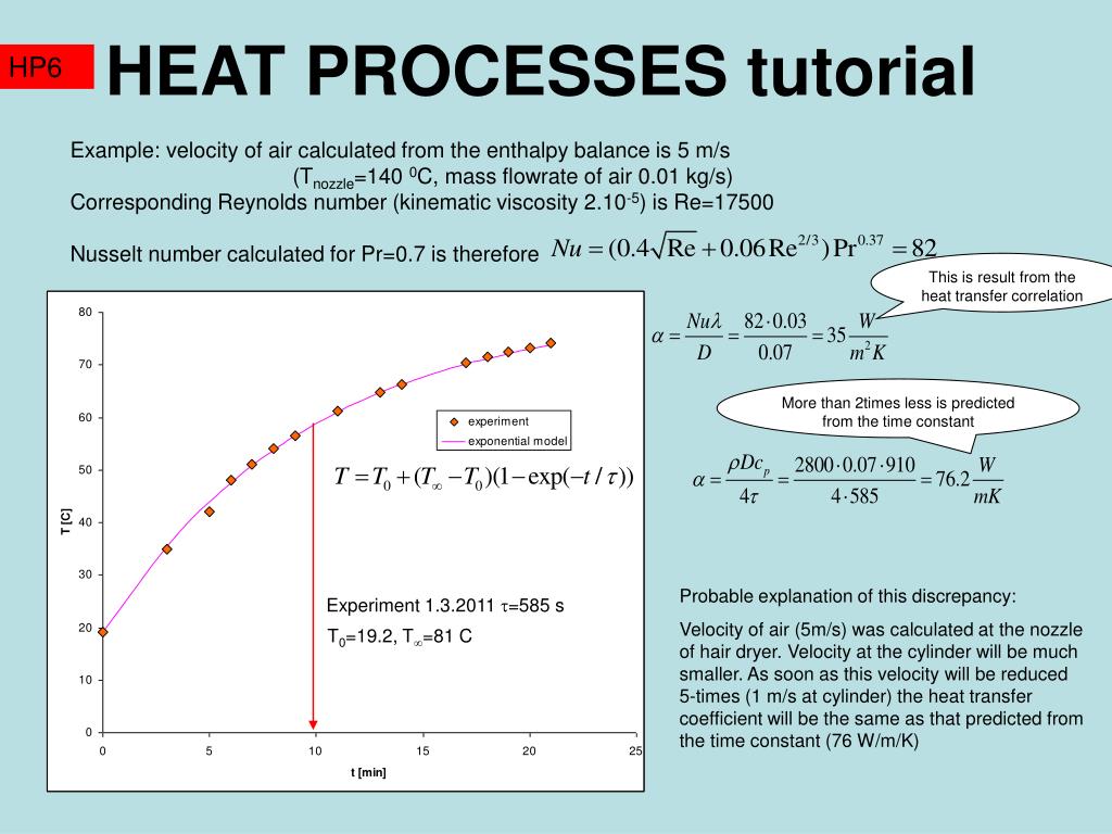 Experiment 1.3.2011 =585 s T0=19.2, T=81 C HEAT PROCESSES tutorial HP6 Example: velocity of air calculated from the enthalpy balance is 5 m/s (Tnozzle=140 0C, mass flowrate of air 0.01 kg/s) Corresponding Reynolds number (kinematic viscosity 2.10-5) is Re=17500 Nusselt number calculated for Pr=0.7 is therefore This is result from the heat transfer correlation More than 2times less is predicted from the time constant Probable explanation of this discrepancy: Velocity of air (5m/s) was calculated at the nozzle of hair dryer. Velocity at the cylinder will be much smaller. As soon as this velocity will be reduced 5-times (1 m/s at cylinder) the heat transfer coefficient will be the same as that predicted from the time constant (76 W/m/K)