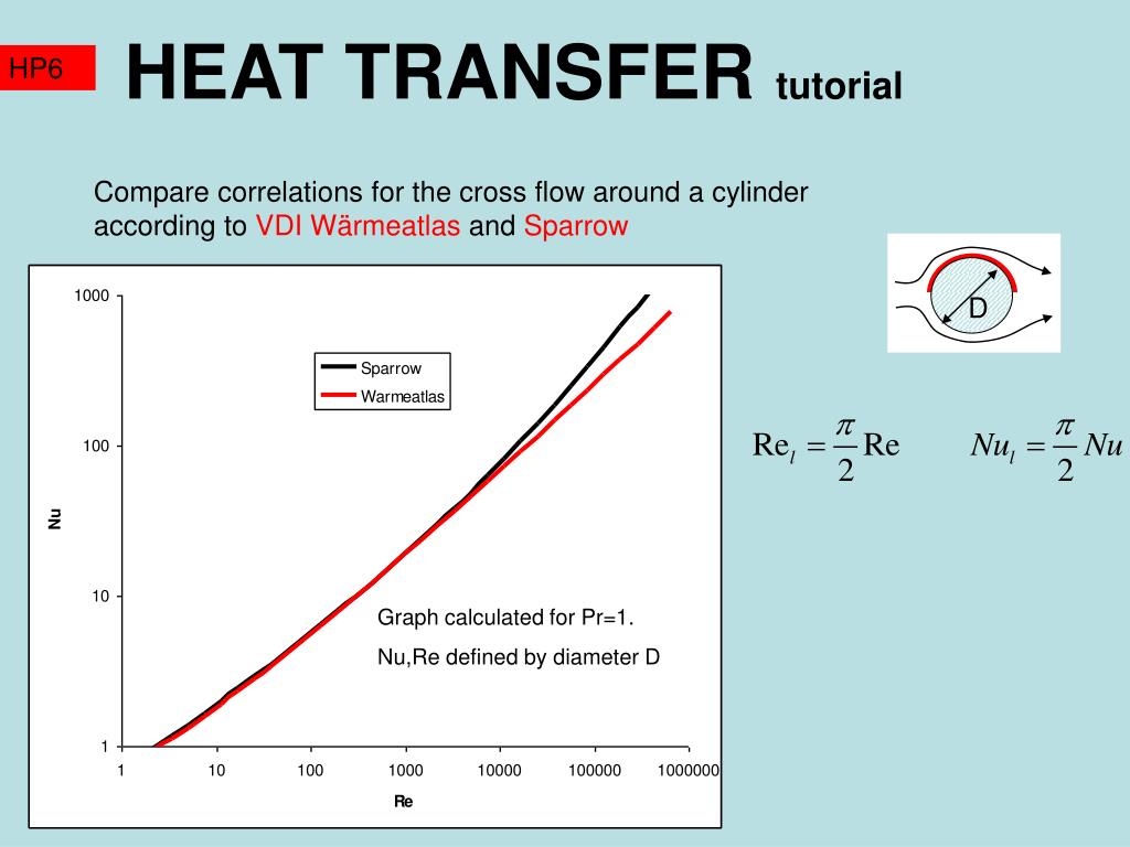 D HEAT TRANSFER tutorial HP6 Compare correlations for the cross flow around a cylinder according to VDI Wärmeatlas and Sparrow Graph calculated for Pr=1. Nu,Re defined by diameter D