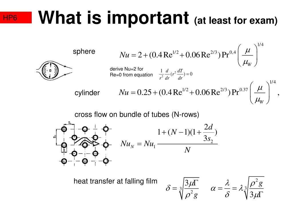 What is important (at least for exam) HP6 sphere derive Nu=2 for Re=0 from equation cylinder cross flow on bundle of tubes (N-rows) heat transfer at falling film