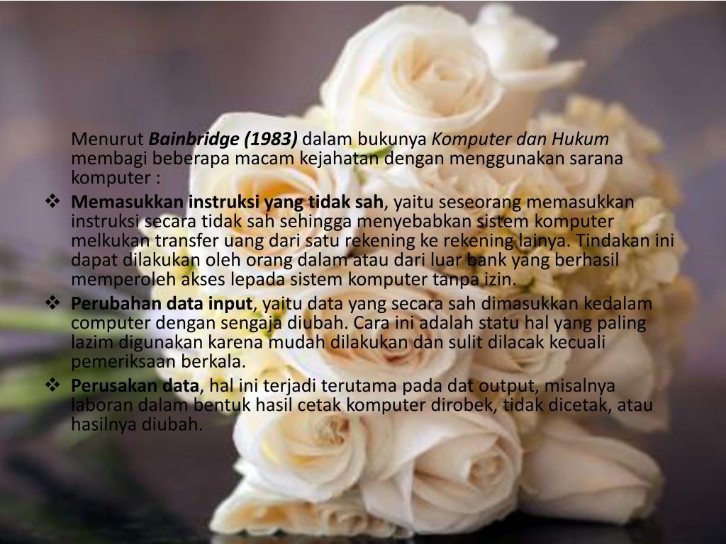 MenurutBainbridge (1983) dalambukunyaKomputer dan Hukummembagibeberapamacamkejahatandenganmenggunakansaranakomputer : • Memasukkaninstruksi yang tidak sah, yaituseseorangmemasukkaninstruksi secara tidak sah sehinggamenyebabkansistemkomputermelkukan transfer uangdarisaturekeningkerekeninglainya. Tindakaninidapatdilakukanolehorangdalamataudariluarbank yang berhasilmemperolehakseslepadasistemkomputertanpaizin. • Perubahan data input, yaitu data yang secara sah dimasukkankedalamcomputerdengansengajadiubah. Cara iniadalah statu hal yang palinglazimdigunakankarenamudahdilakukan dan sulitdilacakkecualipemeriksaanberkala. • Perusakan data, haliniterjaditerutama pada dat output, misalnya laboran dalambentukhasilcetakkomputerdirobek, tidakdicetak, atauhasilnyadiubah.