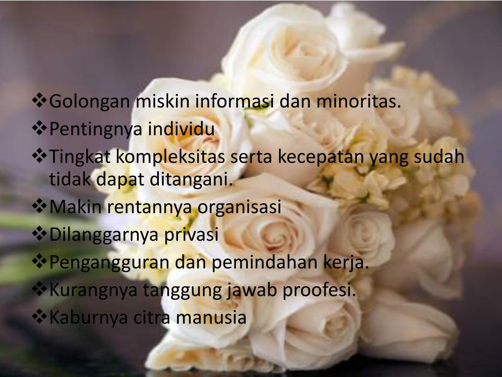Golonganmiskininformasi dan minoritas. • Pentingnyaindividu • Tingkatkompleksitassertakecepatan yang sudahtidakdapatditangani. • Makinrentannyaorganisasi • Dilanggarnyaprivasi • Pengangguran dan pemindahankerja. • Kurangnyatanggungjawabproofesi. • Kaburnyacitramanusia
