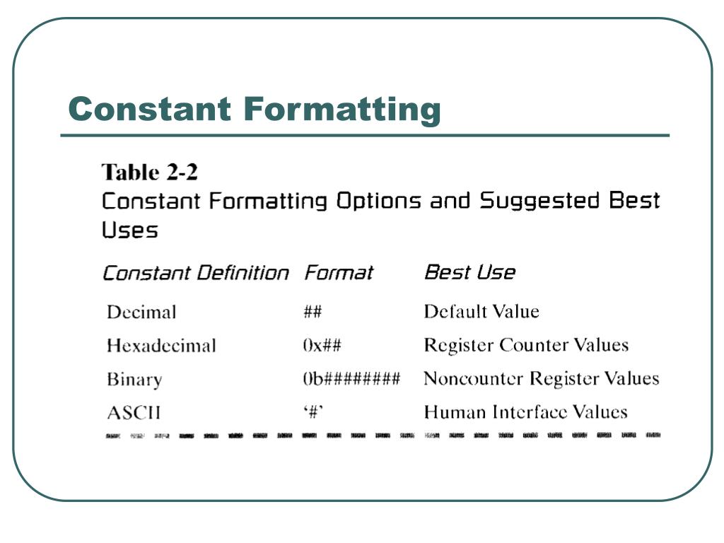 void main() { PORTB = 0; U1MODE = 0x8400; ADPCFG = 0xFFFF; TRISB = 0x49; while(1) // Loop Forever { if ((PORTB & (1 << 3))==0) PORTB = '3'; else PORTB = 4; } } void main() { PORTB = 0; U1MODE = 0b1000010000000000; ADPCFG = 0b1111111111111111; TRISB = 0b0100 1001 ; while(1) // Loop Forever { if (PORTBbits.RB3==0) PORTB = 0b00110011; else PORTB = 0b000100; } } Constant Formatting