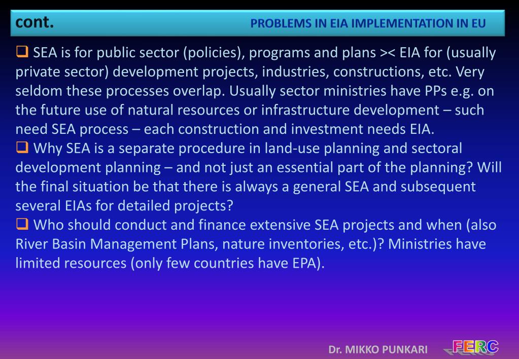 SEA is for public sector (policies), programs and plans >< EIA for (usually private sector) development projects, industries, constructions, etc. Very seldom these processes overlap. Usually sector ministries have PPs e.g. on the future use of natural resources or infrastructure development – such need SEA process – each construction and investment needs EIA. • Why SEA is a separate procedure in land-use planning and sectoral development planning – and not just an essential part of the planning? Will the final situation be that there is always a general SEA and subsequent several EIAs for detailed projects? • Who should conduct and finance extensive SEA projects and when (also River Basin Management Plans, nature inventories, etc.)? Ministries have limited resources (only few countries have EPA). cont. PROBLEMS IN EIA IMPLEMENTATION IN EU FERC Dr. MIKKO PUNKARI