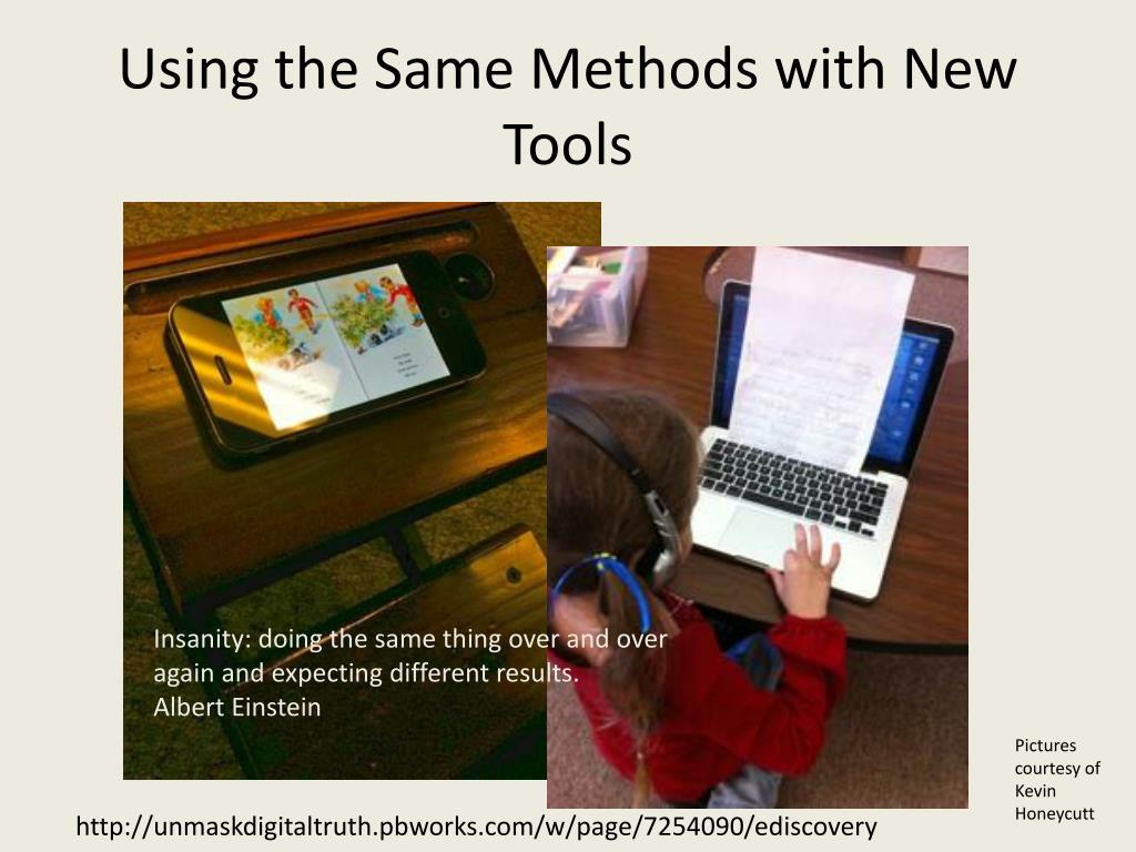 Using the Same Methods with New Tools Insanity: doing the same thing over and over again and expecting different results. Albert Einstein Pictures courtesy of Kevin Honeycutt http://unmaskdigitaltruth.pbworks.com/w/page/7254090/ediscovery