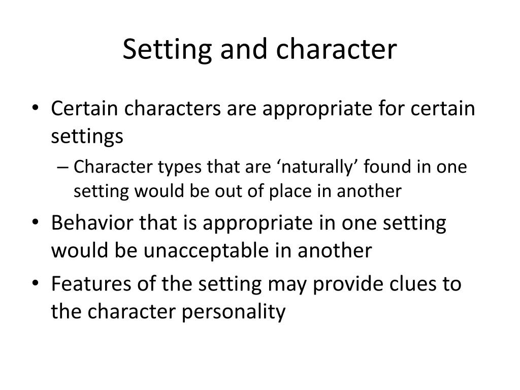 Setting and character • Certain characters are appropriate for certain settings • Character types that are ‘naturally’ found in one setting would be out of place in another • Behavior that is appropriate in one setting would be unacceptable in another • Features of the setting may provide clues to the character personality
