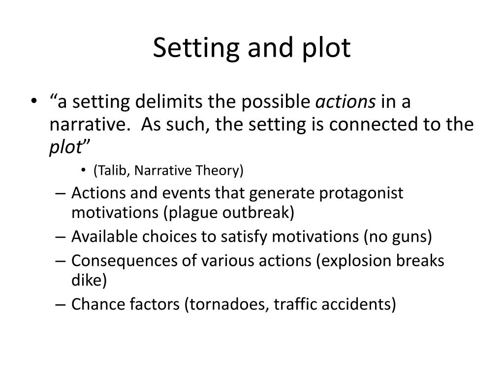 Setting and plot • “a setting delimits the possible actions in a narrative. As such, the setting is connected to the plot” • (Talib, Narrative Theory) • Actions and events that generate protagonist motivations (plague outbreak) • Available choices to satisfy motivations (no guns) • Consequences of various actions (explosion breaks dike) • Chance factors (tornadoes, traffic accidents)