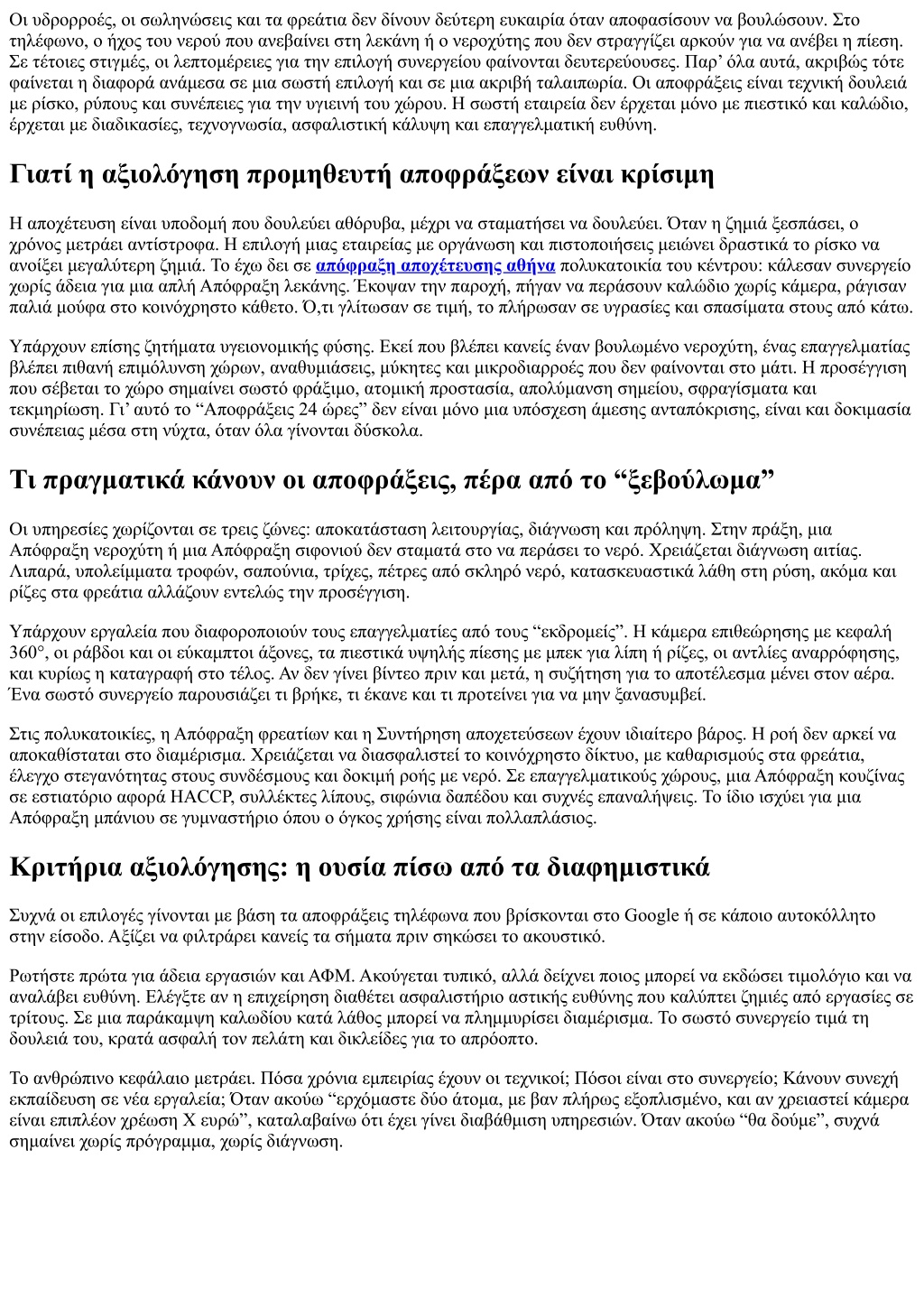 Οι υδρορροές, οι σωληνώσεις και τα φρεάτια δεν δίνουν δεύτερη ευκαιρία όταν αποφασίσουν να βουλώσουν. Στο τηλέφωνο, ο ήχος του νερού που ανεβαίνει στη λεκάνη ή ο νεροχύτης που δεν στραγγίζει αρκούν για να ανέβει η πίεση. Σε τέτοιες στιγμές, οι λεπτομέρειες για την επιλογή συνεργείου φαίνονται δευτερεύουσες. Παρ’ όλα αυτά, ακριβώς τότε φαίνεται η διαφορά ανάμεσα σε μια σωστή επιλογή και σε μια ακριβή ταλαιπωρία. Οι αποφράξεις είναι τεχνική δουλειά με ρίσκο, ρύπους και συνέπειες για την υγιεινή του χώρου. Η σωστή εταιρεία δεν έρχεται μόνο με πιεστικό και καλώδιο, έρχεται με διαδικασίες, τεχνογνωσία, ασφαλιστική κάλυψη και επαγγελματική ευθύνη. Γιατί η αξιολόγηση προμηθευτή αποφράξεων είναι κρίσιμη Η αποχέτευση είναι υποδομή που δουλεύει αθόρυβα, μέχρι να σταματήσει να δουλεύει. Όταν η ζημιά ξεσπάσει, ο χρόνος μετράει αντίστροφα. Η επιλογή μιας εταιρείας με οργάνωση και πιστοποιήσεις μειώνει δραστικά το ρίσκο να ανοίξει μεγαλύτερη ζημιά. Το έχω δει σε απόφραξη αποχέτευσης αθήνα πολυκατοικία του κέντρου: κάλεσαν συνεργείο χωρίς άδεια για μια απλή Απόφραξη λεκάνης. Έκοψαν την παροχή, πήγαν να περάσουν καλώδιο χωρίς κάμερα, ράγισαν παλιά μούφα στο κοινόχρηστο κάθετο. Ό,τι γλίτωσαν σε τιμή, το πλήρωσαν σε υγρασίες και σπασίματα στους από κάτω. Υπάρχουν επίσης ζητήματα υγειονομικής φύσης. Εκεί που βλέπει κανείς έναν βουλωμένο νεροχύτη, ένας επαγγελματίας βλέπει πιθανή επιμόλυνση χώρων, αναθυμιάσεις, μύκητες και μικροδιαρροές που δεν φαίνονται στο μάτι. Η προσέγγιση που σέβεται το χώρο σημαίνει σωστό φράξιμο, ατομική προστασία, απολύμανση σημείου, σφραγίσματα και τεκμηρίωση. Γι’ αυτό το “Αποφράξεις 24 ώρες” δεν είναι μόνο μια υπόσχεση άμεσης ανταπόκρισης, είναι και δοκιμασία συνέπειας μέσα στη νύχτα, όταν όλα γίνονται δύσκολα. Τι πραγματικά κάνουν οι αποφράξεις, πέρα από το “ξεβούλωμα” Οι υπηρεσίες χωρίζονται σε τρεις ζώνες: αποκατάσταση λειτουργίας, διάγνωση και πρόληψη. Στην πράξη, μια Απόφραξη νεροχύτη ή μια Απόφραξη σιφονιού δεν σταματά στο να περάσει το νερό. Χρειάζεται διάγνωση αιτίας. Λιπαρά, υπολείμματα τροφών, σαπούνια, τρίχες, πέτρες από σκληρό νερό, κατασκευαστικά λάθη στη ρύση, ακόμα και ρίζες στα φρεάτια αλλάζουν εντελώς την προσέγγιση. Υπάρχουν εργαλεία που διαφοροποιούν τους επαγγελματίες από τους “εκδρομείς”. Η κάμερα επιθεώρησης με κεφαλή 360°, οι ράβδοι και οι εύκαμπτοι άξονες, τα πιεστικά υψηλής πίεσης με μπεκ για λίπη ή ρίζες, οι αντλίες αναρρόφησης, και κυρίως η καταγραφή στο τέλος. Αν δεν γίνει βίντεο πριν και μετά, η συζήτηση για το αποτέλεσμα μένει στον αέρα. Ένα σωστό συνεργείο παρουσιάζει τι βρήκε, τι έκανε και τι προτείνει για να μην ξανασυμβεί. Στις πολυκατοικίες, η Απόφραξη φρεατίων και η Συντήρηση αποχετεύσεων έχουν ιδιαίτερο βάρος. Η ροή δεν αρκεί να αποκαθίσταται στο διαμέρισμα. Χρειάζεται να διασφαλιστεί το κοινόχρηστο δίκτυο, με καθαρισμούς στα φρεάτια, έλεγχο στεγανότητας στους συνδέσμους και δοκιμή ροής με νερό. Σε επαγγελματικούς χώρους, μια Απόφραξη κουζίνας σε εστιατόριο αφορά HACCP, συλλέκτες λίπους, σιφώνια δαπέδου και συχνές επαναλήψεις. Το ίδιο ισχύει για μια Απόφραξη μπάνιου σε γυμναστήριο όπου ο όγκος χρήσης είναι πολλαπλάσιος. Κριτήρια αξιολόγησης: η ουσία πίσω από τα διαφημιστικά Συχνά οι επιλογές γίνονται με βάση τα αποφράξεις τηλέφωνα που βρίσκονται στο Google ή σε κάποιο αυτοκόλλητο 