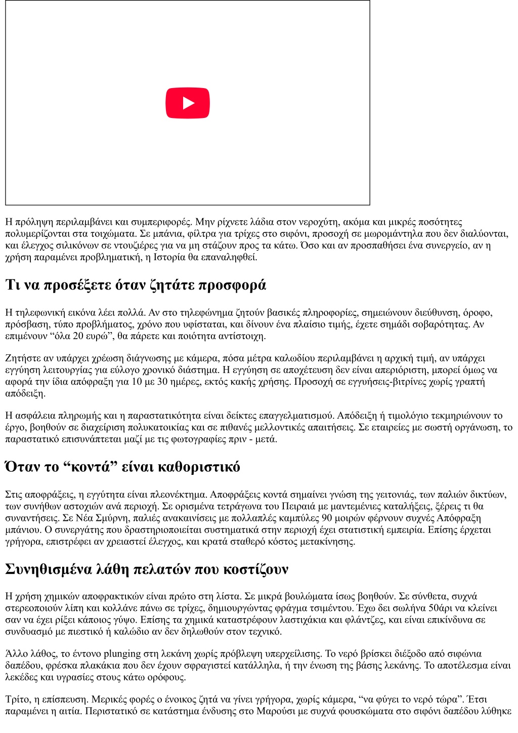 Η πρόληψη περιλαμβάνει και συμπεριφορές. Μην ρίχνετε λάδια στον νεροχύτη, ακόμα και μικρές ποσότητες πολυμερίζονται στα τοιχώματα. Σε μπάνια, φίλτρα για τρίχες στο σιφόνι, προσοχή σε μωρομάντηλα που δεν διαλύονται, και έλεγχος σιλικόνων σε ντουζιέρες για να μη στάζουν προς τα κάτω. Όσο και αν προσπαθήσει ένα συνεργείο, αν η χρήση παραμένει προβληματική, η Ιστορία θα επαναληφθεί. Τι να προσέξετε όταν ζητάτε προσφορά Η τηλεφωνική εικόνα λέει πολλά. Αν στο τηλεφώνημα ζητούν βασικές πληροφορίες, σημειώνουν διεύθυνση, όροφο, πρόσβαση, τύπο προβλήματος, χρόνο που υφίσταται, και δίνουν ένα πλαίσιο τιμής, έχετε σημάδι σοβαρότητας. Αν επιμένουν “όλα 20 ευρώ”, θα πάρετε και ποιότητα αντίστοιχη. Ζητήστε αν υπάρχει χρέωση διάγνωσης με κάμερα, πόσα μέτρα καλωδίου περιλαμβάνει η αρχική τιμή, αν υπάρχει εγγύηση λειτουργίας για εύλογο χρονικό διάστημα. Η εγγύηση σε αποχέτευση δεν είναι απεριόριστη, μπορεί όμως να αφορά την ίδια απόφραξη για 10 με 30 ημέρες, εκτός κακής χρήσης. Προσοχή σε εγγυήσεις-βιτρίνες χωρίς γραπτή απόδειξη. Η ασφάλεια πληρωμής και η παραστατικότητα είναι δείκτες επαγγελματισμού. Απόδειξη ή τιμολόγιο τεκμηριώνουν το έργο, βοηθούν σε διαχείριση πολυκατοικίας και σε πιθανές μελλοντικές απαιτήσεις. Σε εταιρείες με σωστή οργάνωση, το παραστατικό επισυνάπτεται μαζί με τις φωτογραφίες πριν - μετά. Όταν το “κοντά” είναι καθοριστικό Στις αποφράξεις, η εγγύτητα είναι πλεονέκτημα. Αποφράξεις κοντά σημαίνει γνώση της γειτονιάς, των παλιών δικτύων, των συνήθων αστοχιών ανά περιοχή. Σε ορισμένα τετράγωνα του Πειραιά με μαντεμένιες καταλήξεις, ξέρεις τι θα συναντήσεις. Σε Νέα Σμύρνη, παλιές ανακαινίσεις με πολλαπλές καμπύλες 90 μοιρών φέρνουν συχνές Απόφραξη μπάνιου. Ο συνεργάτης που δραστηριοποιείται συστηματικά στην περιοχή έχει στατιστική εμπειρία. Επίσης έρχεται γρήγορα, επιστρέφει αν χρειαστεί έλεγχος, και κρατά σταθερό κόστος μετακίνησης. Συνηθισμένα λάθη πελατών που κοστίζουν Η χρήση χημικών αποφρακτικών είναι πρώτο στη λίστα. Σε μικρά βουλώματα ίσως βοηθούν. Σε σύνθετα, συχνά στερεοποιούν λίπη και κολλάνε πάνω σε τρίχες, δημιουργώντας φράγμα τσιμέντου. Έχω δει σωλήνα 50άρι να κλείνει σαν να έχει ρίξει κάποιος γύψο. Επίσης τα χημικά καταστρέφουν λαστιχάκια και φλάντζες, και είναι επικίνδυνα σε συνδυασμό με πιεστικό ή καλώδιο αν δεν δηλωθούν στον τεχνικό. Άλλο λάθος, το έντονο plunging στη λεκάνη χωρίς πρόβλεψη υπερχείλισης. Το νερό βρίσκει διέξοδο από σιφώνια δαπέδου, φρέσκα πλακάκια που δεν έχουν σφραγιστεί κατάλληλα, ή την ένωση της βάσης λεκάνης. Το αποτέλεσμα είναι λεκέδες και υγρασίες στους κάτω ορόφους. Τρίτο, η επίσπευση. Μερικές φορές ο ένοικος ζητά να γίνει γρήγορα, χωρίς κάμερα, “να φύγει το νερό τώρα”. Έτσι παραμένει η αιτία. Περιστατικό σε κατάστημα ένδυσης στο Μαρούσι με συχνά φουσκώματα στο σιφόνι δαπέδου λύθηκε