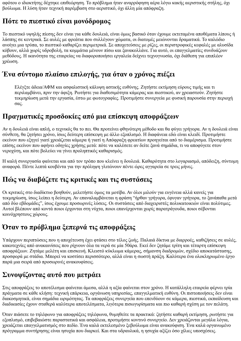αφότου ο ιδιοκτήτης δέχτηκε επιθεώρηση. Το πρόβλημα ήταν αναρρόφηση αέρα λόγω κακής αεριστικής στήλης, όχι βούλωμα. Η λύση ήταν τεχνική παρέμβαση στο αεριστικό, όχι άλλη μία απόφραξη. Πότε το πιεστικό είναι μονόδρομος Το πιεστικό υψηλής πίεσης δεν είναι για κάθε δουλειά, είναι όμως βασικό όταν έχουμε εκτεταμένα αποθέματα λίπους ή λάσπης σε κεντρικά. Σε αυλές με φρεάτια που συλλέγουν χώματα, οι διατομές μειώνονται δραματικά. Το καλώδιο ανοίγει μια τρύπα, το πιεστικό καθαρίζει περιμετρικά. Σε αποχετεύσεις με ρίζες, οι περιστροφικές κεφαλές με αλυσίδα κόβουν, αλλά χωρίς υδροβολή, τα κομμάτια μένουν πίσω και ξανακολλάνε. Για αυτό, οι επαγγελματίες συνδυάζουν μεθόδους. Η ικανότητα της εταιρείας να διαφοροποιήσει εργαλεία δείχνει τεχνογνωσία, όχι διάθεση για επιπλέον χρέωση. Ένα σύντομο πλαίσιο επιλογής, για όταν ο χρόνος πιέζει Ελέγξτε άδεια/ΑΦΜ και ασφαλιστική κάλυψη αστικής ευθύνης. Ζητήστε εκτίμηση εύρους τιμής και τι περιλαμβάνει, πριν την άφιξη. Ρωτήστε για διαθεσιμότητα κάμερας και πιεστικού, αν χρειαστούν. Ζητήστε τεκμηρίωση μετά την εργασία, έστω με φωτογραφίες. Προτιμήστε συνεργεία με φυσική παρουσία στην περιοχή σας. Πραγματικές προσδοκίες από μια επίσκεψη αποφράξεων Αν η δουλειά είναι απλή, ο τεχνικός θα το πει. Θα προτείνει φθηνότερη μέθοδο και θα φύγει γρήγορα. Αν η δουλειά είναι σύνθετη, θα ζητήσει χρόνο, ίσως δεύτερη επίσκεψη με άλλο εξοπλισμό. Η διαφάνεια εδώ είναι κλειδί. Προτιμήστε εκείνον που εξηγεί γιατί χρειάζεται κάμερα ή γιατί η Απόφραξη φρεατίων προηγείται από το διαμέρισμα. Προτιμήστε επίσης εκείνον που αφήνει οδηγίες χρήσης μετά: πότε να καλέσετε αν δείτε ξανά σημάδια, τι να αποφύγετε στον νεροχύτη, και πότε βολεύει να γίνει προληπτικός καθαρισμός. Η καλή συνεργασία φαίνεται και από τον τρόπο που κλείνει η δουλειά. Καθαρότητα στο λογαριασμό, απόδειξη, σύντομη αναφορά. Πέντε λεπτά κουβέντα για την πρόληψη γλιτώνουν πέντε ώρες αγγαρεία σε τρεις μήνες. Πώς να διαβάζετε τις κριτικές και τις συστάσεις Οι κριτικές στο διαδίκτυο βοηθούν, μελετήστε όμως τα μοτίβα. Αν όλοι μιλούν για ευγένεια αλλά κανείς για τεκμηρίωση, ίσως λείπει η δεύτερη. Αν επαναλαμβάνεται η φράση “ήρθαν γρήγορα, έφυγαν γρήγορα, το ξανάπαθα μετά από δύο εβδομάδες”, ίσως έχουμε προσωρινές λύσεις. Οι συστάσεις από διαχειριστές πολυκατοικιών είναι πολύτιμες. Αυτοί βλέπουν από κοντά ποιοι έρχονται στη νύχτα, ποιοι επανέρχονται χωρίς παρατράγουδα, ποιοι σέβονται κοινόχρηστους χώρους. Όταν το πρόβλημα ξεπερνά τις αποφράξεις Υπάρχουν περιπτώσεις που η αποχέτευση έχει φτάσει στο τέλος ζωής. Παλαιά δίκτυα με διαρροές, καθιζήσεις σε αυλές, κακοτεχνίες από ανακαινίσεις που ρίχνουν όλα τα νερά σε μία 50άρα. Εκεί δεν ζητάμε τρίτη και τέταρτη επίσκεψη αποφράξεων. Ζητάμε μελέτη και επισκευή. Κλειστό κύκλωμα κάμερας, σήμανση διαδρομών, σχέδιο αποκατάστασης, προσφορά με στάδια. Μπορεί να κοστίσει περισσότερο, αλλά είναι η σωστή πράξη. Καλύτερα ένα ολοκληρωμένο έργο παρά μια σειρά από προσωρινές ανακουφίσεις. Συνοψίζοντας αυτό που μετράει Στις αποφράξεις το αποτέλεσμα φαίνεται άμεσα, αλλά η αξία φαίνεται στον χρόνο. Η κατάλληλη εταιρεία φέρνει τρία πράγματα σε κάθε κλήση: τεχνική επάρκεια, οργάνωση υπηρεσίας, επαγγελματική ευθύνη. Οι πιστοποιήσεις δεν είναι διακοσμητικά, είναι σημάδια ωριμότητας. Τα αποφράξεις συνεργεία που επενδύουν σε κάμερα, πιεστ