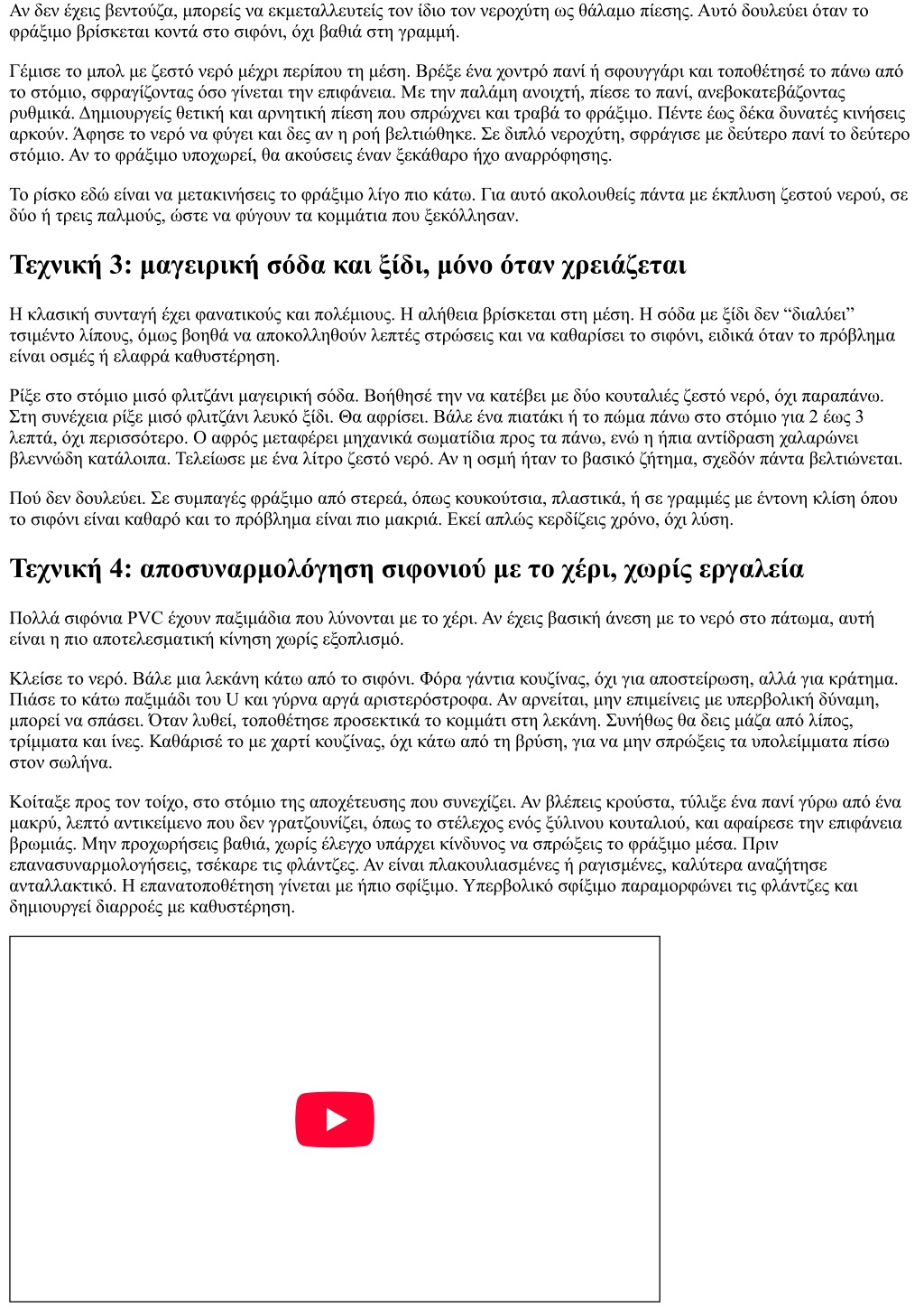 Αν δεν έχεις βεντούζα, μπορείς να εκμεταλλευτείς τον ίδιο τον νεροχύτη ως θάλαμο πίεσης. Αυτό δουλεύει όταν το φράξιμο βρίσκεται κοντά στο σιφόνι, όχι βαθιά στη γραμμή. Γέμισε το μπολ με ζεστό νερό μέχρι περίπου τη μέση. Βρέξε ένα χοντρό πανί ή σφουγγάρι και τοποθέτησέ το πάνω από το στόμιο, σφραγίζοντας όσο γίνεται την επιφάνεια. Με την παλάμη ανοιχτή, πίεσε το πανί, ανεβοκατεβάζοντας ρυθμικά. Δημιουργείς θετική και αρνητική πίεση που σπρώχνει και τραβά το φράξιμο. Πέντε έως δέκα δυνατές κινήσεις αρκούν. Άφησε το νερό να φύγει και δες αν η ροή βελτιώθηκε. Σε διπλό νεροχύτη, σφράγισε με δεύτερο πανί το δεύτερο στόμιο. Αν το φράξιμο υποχωρεί, θα ακούσεις έναν ξεκάθαρο ήχο αναρρόφησης. Το ρίσκο εδώ είναι να μετακινήσεις το φράξιμο λίγο πιο κάτω. Για αυτό ακολουθείς πάντα με έκπλυση ζεστού νερού, σε δύο ή τρεις παλμούς, ώστε να φύγουν τα κομμάτια που ξεκόλλησαν. Τεχνική 3: μαγειρική σόδα και ξίδι, μόνο όταν χρειάζεται Η κλασική συνταγή έχει φανατικούς και πολέμιους. Η αλήθεια βρίσκεται στη μέση. Η σόδα με ξίδι δεν “διαλύει” τσιμέντο λίπους, όμως βοηθά να αποκολληθούν λεπτές στρώσεις και να καθαρίσει το σιφόνι, ειδικά όταν το πρόβλημα είναι οσμές ή ελαφρά καθυστέρηση. Ρίξε στο στόμιο μισό φλιτζάνι μαγειρική σόδα. Βοήθησέ την να κατέβει με δύο κουταλιές ζεστό νερό, όχι παραπάνω. Στη συνέχεια ρίξε μισό φλιτζάνι λευκό ξίδι. Θα αφρίσει. Βάλε ένα πιατάκι ή το πώμα πάνω στο στόμιο για 2 έως 3 λεπτά, όχι περισσότερο. Ο αφρός μεταφέρει μηχανικά σωματίδια προς τα πάνω, ενώ η ήπια αντίδραση χαλαρώνει βλεννώδη κατάλοιπα. Τελείωσε με ένα λίτρο ζεστό νερό. Αν η οσμή ήταν το βασικό ζήτημα, σχεδόν πάντα βελτιώνεται. Πού δεν δουλεύει. Σε συμπαγές φράξιμο από στερεά, όπως κουκούτσια, πλαστικά, ή σε γραμμές με έντονη κλίση όπου το σιφόνι είναι καθαρό και το πρόβλημα είναι πιο μακριά. Εκεί απλώς κερδίζεις χρόνο, όχι λύση. Τεχνική 4: αποσυναρμολόγηση σιφονιού με το χέρι, χωρίς εργαλεία Πολλά σιφόνια PVC έχουν παξιμάδια που λύνονται με το χέρι. Αν έχεις βασική άνεση με το νερό στο πάτωμα, αυτή είναι η πιο αποτελεσματική κίνηση χωρίς εξοπλισμό. Κλείσε το νερό. Βάλε μια λεκάνη κάτω από το σιφόνι. Φόρα γάντια κουζίνας, όχι για αποστείρωση, αλλά για κράτημα. Πιάσε το κάτω παξιμάδι του U και γύρνα αργά αριστερόστροφα. Αν αρνείται, μην επιμείνεις με υπερβολική δύναμη, μπορεί να σπάσει. Όταν λυθεί, τοποθέτησε προσεκτικά το κομμάτι στη λεκάνη. Συνήθως θα δεις μάζα από λίπος, τρίμματα και ίνες. Καθάρισέ το με χαρτί κουζίνας, όχι κάτω από τη βρύση, για να μην σπρώξεις τα υπολείμματα πίσω στον σωλήνα. Κοίταξε προς τον τοίχο, στο στόμιο της αποχέτευσης που συνεχίζει. Αν βλέπεις κρούστα, τύλιξε ένα πανί γύρω από ένα μακρύ, λεπτό αντικείμενο που δεν γρατζουνίζει, όπως το στέλεχος ενός ξύλινου κουταλιού, και αφαίρεσε την επιφάνεια βρωμιάς. Μην προχωρήσεις βαθιά, χωρίς έλεγχο υπάρχει κίνδυνος να σπρώξεις το φράξιμο μέσα. Πριν επανασυναρμολογήσεις, τσέκαρε τις φλάντζες. Αν είναι πλακουλιασμένες ή ραγισμένες, καλύτερα αναζήτησε ανταλλακτικό. Η επανατοποθέτηση γίνεται με ήπιο σφίξιμο. Υπερβολικό σφίξιμο παραμορφώνει τις φλάντζες και δημιουργεί διαρροές με καθυστέρηση.