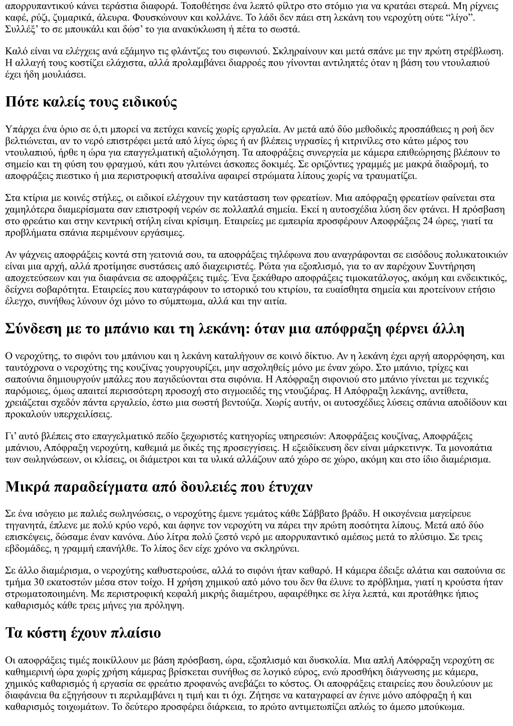 απορρυπαντικού κάνει τεράστια διαφορά. Τοποθέτησε ένα λεπτό φίλτρο στο στόμιο για να κρατάει στερεά. Μη ρίχνεις καφέ, ρύζι, ζυμαρικά, άλευρα. Φουσκώνουν και κολλάνε. Το λάδι δεν πάει στη λεκάνη του νεροχύτη ούτε “λίγο”. Συλλέξ’ το σε μπουκάλι και δώσ’ το για ανακύκλωση ή πέτα το σωστά. Καλό είναι να ελέγχεις ανά εξάμηνο τις φλάντζες του σιφωνιού. Σκληραίνουν και μετά σπάνε με την πρώτη στρέβλωση. Η αλλαγή τους κοστίζει ελάχιστα, αλλά προλαμβάνει διαρροές που γίνονται αντιληπτές όταν η βάση του ντουλαπιού έχει ήδη μουλιάσει. Πότε καλείς τους ειδικούς Υπάρχει ένα όριο σε ό,τι μπορεί να πετύχει κανείς χωρίς εργαλεία. Αν μετά από δύο μεθοδικές προσπάθειες η ροή δεν βελτιώνεται, αν το νερό επιστρέφει μετά από λίγες ώρες ή αν βλέπεις υγρασίες ή κιτρινίλες στο κάτω μέρος του ντουλαπιού, ήρθε η ώρα για επαγγελματική αξιολόγηση. Τα αποφράξεις συνεργεία με κάμερα επιθεώρησης βλέπουν το σημείο και τη φύση του φραγμού, κάτι που γλιτώνει άσκοπες δοκιμές. Σε οριζόντιες γραμμές με μακρά διαδρομή, το αποφράξεις πιεστικο ή μια περιστροφική ατσαλίνα αφαιρεί στρώματα λίπους χωρίς να τραυματίζει. Στα κτίρια με κοινές στήλες, οι ειδικοί ελέγχουν την κατάσταση των φρεατίων. Μια απόφραξη φρεατίων φαίνεται στα χαμηλότερα διαμερίσματα σαν επιστροφή νερών σε πολλαπλά σημεία. Εκεί η αυτοσχέδια λύση δεν φτάνει. Η πρόσβαση στο φρεάτιο και στην κεντρική στήλη είναι κρίσιμη. Εταιρείες με εμπειρία προσφέρουν Αποφράξεις 24 ώρες, γιατί τα προβλήματα σπάνια περιμένουν εργάσιμες. Αν ψάχνεις αποφράξεις κοντά στη γειτονιά σου, τα αποφράξεις τηλέφωνα που αναγράφονται σε εισόδους πολυκατοικιών είναι μια αρχή, αλλά προτίμησε συστάσεις από διαχειριστές. Ρώτα για εξοπλισμό, για το αν παρέχουν Συντήρηση αποχετεύσεων και για διαφάνεια σε αποφράξεις τιμές. Ένα ξεκάθαρο αποφράξεις τιμοκατάλογος, ακόμη και ενδεικτικός, δείχνει σοβαρότητα. Εταιρείες που καταγράφουν το ιστορικό του κτιρίου, τα ευαίσθητα σημεία και προτείνουν ετήσιο έλεγχο, συνήθως λύνουν όχι μόνο το σύμπτωμα, αλλά και την αιτία. Σύνδεση με το μπάνιο και τη λεκάνη: όταν μια απόφραξη φέρνει άλλη Ο νεροχύτης, το σιφόνι του μπάνιου και η λεκάνη καταλήγουν σε κοινό δίκτυο. Αν η λεκάνη έχει αργή απορρόφηση, και ταυτόχρονα ο νεροχύτης της κουζίνας γουργουρίζει, μην ασχοληθείς μόνο με έναν χώρο. Στο μπάνιο, τρίχες και σαπούνια δημιουργούν μπάλες που παγιδεύονται στα σιφόνια. Η Απόφραξη σιφονιού στο μπάνιο γίνεται με τεχνικές παρόμοιες, όμως απαιτεί περισσότερη προσοχή στο σιγμοειδές της ντουζιέρας. Η Απόφραξη λεκάνης, αντίθετα, χρειάζεται σχεδόν πάντα εργαλείο, έστω μια σωστή βεντούζα. Χωρίς αυτήν, οι αυτοσχέδιες λύσεις σπάνια αποδίδουν και προκαλούν υπερχειλίσεις. Γι’ αυτό βλέπεις στο επαγγελματικό πεδίο ξεχωριστές κατηγορίες υπηρεσιών: Αποφράξεις κουζίνας, Αποφράξεις μπάνιου, Απόφραξη νεροχύτη, καθεμιά με δικές της προσεγγίσεις. Η εξειδίκευση δεν είναι μάρκετινγκ. Τα μονοπάτια των σωληνώσεων, οι κλίσεις, οι διάμετροι και τα υλικά αλλάζουν από χώρο σε χώρο, ακόμη και στο ίδιο διαμέρισμα. Μικρά παραδείγματα από δουλειές που έτυχαν Σε ένα ισόγειο με παλιές σωληνώσεις, ο νεροχύτης έμενε γεμάτος κάθε Σάββατο βράδυ. Η οικογένεια μαγείρευε τηγανητά, έπλενε με πολύ κρύο νερό, και άφηνε τον νεροχύτη να πάρει την πρώτη ποσότητα λίπους. Μετά από δύο επισκέψεις, δώσαμε έναν κανόνα. Δύο λίτρα πολύ ζεστό νερό με απορρυπαν