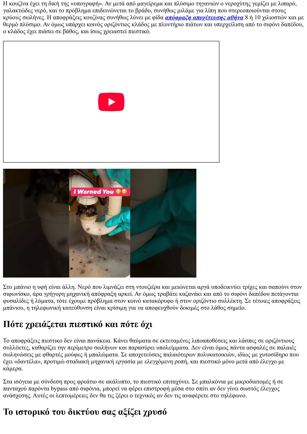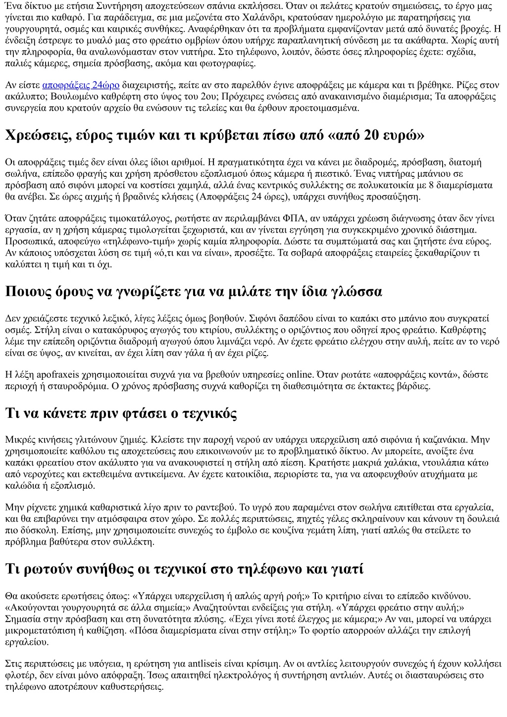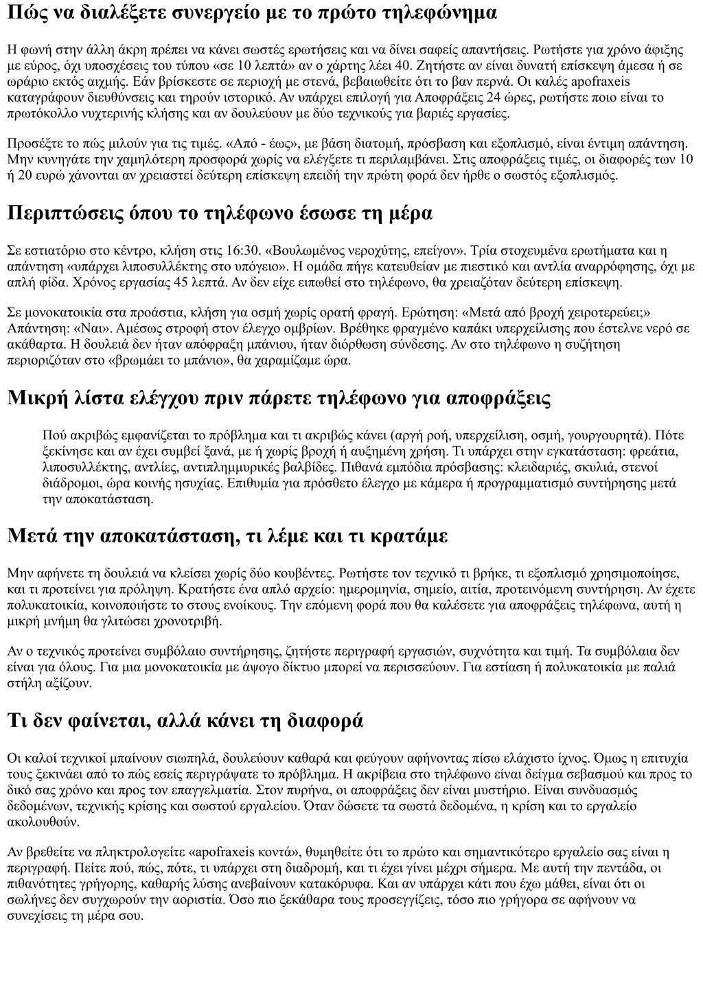 Πώς να διαλέξετε συνεργείο με το πρώτο τηλεφώνημα Η φωνή στην άλλη άκρη πρέπει να κάνει σωστές ερωτήσεις και να δίνει σαφείς απαντήσεις. Ρωτήστε για χρόνο άφιξης με εύρος, όχι υποσχέσεις του τύπου «σε 10 λεπτά» αν ο χάρτης λέει 40. Ζητήστε αν είναι δυνατή επίσκεψη άμεσα ή σε ωράριο εκτός αιχμής. Εάν βρίσκεστε σε περιοχή με στενά, βεβαιωθείτε ότι το βαν περνά. Οι καλές apofraxeis καταγράφουν διευθύνσεις και τηρούν ιστορικό. Αν υπάρχει επιλογή για Αποφράξεις 24 ώρες, ρωτήστε ποιο είναι το πρωτόκολλο νυχτερινής κλήσης και αν δουλεύουν με δύο τεχνικούς για βαριές εργασίες. Προσέξτε το πώς μιλούν για τις τιμές. «Από - έως», με βάση διατομή, πρόσβαση και εξοπλισμό, είναι έντιμη απάντηση. Μην κυνηγάτε την χαμηλότερη προσφορά χωρίς να ελέγξετε τι περιλαμβάνει. Στις αποφράξεις τιμές, οι διαφορές των 10 ή 20 ευρώ χάνονται αν χρειαστεί δεύτερη επίσκεψη επειδή την πρώτη φορά δεν ήρθε ο σωστός εξοπλισμός. Περιπτώσεις όπου το τηλέφωνο έσωσε τη μέρα Σε εστιατόριο στο κέντρο, κλήση στις 16:30. «Βουλωμένος νεροχύτης, επείγον». Τρία στοχευμένα ερωτήματα και η απάντηση «υπάρχει λιποσυλλέκτης στο υπόγειο». Η ομάδα πήγε κατευθείαν με πιεστικό και αντλία αναρρόφησης, όχι με απλή φίδα. Χρόνος εργασίας 45 λεπτά. Αν δεν είχε ειπωθεί στο τηλέφωνο, θα χρειαζόταν δεύτερη επίσκεψη. Σε μονοκατοικία στα προάστια, κλήση για οσμή χωρίς ορατή φραγή. Ερώτηση: «Μετά από βροχή χειροτερεύει;» Απάντηση: «Ναι». Αμέσως στροφή στον έλεγχο ομβρίων. Βρέθηκε φραγμένο καπάκι υπερχείλισης που έστελνε νερό σε ακάθαρτα. Η δουλειά δεν ήταν απόφραξη μπάνιου, ήταν διόρθωση σύνδεσης. Αν στο τηλέφωνο η συζήτηση περιοριζόταν στο «βρωμάει το μπάνιο», θα χαραμίζαμε ώρα. Μικρή λίστα ελέγχου πριν πάρετε τηλέφωνο για αποφράξεις Πού ακριβώς εμφανίζεται το πρόβλημα και τι ακριβώς κάνει (αργή ροή, υπερχείλιση, οσμή, γουργουρητά). Πότε ξεκίνησε και αν έχει συμβεί ξανά, με ή χωρίς βροχή ή αυξημένη χρήση. Τι υπάρχει στην εγκατάσταση: φρεάτια, λιποσυλλέκτης, αντλίες, αντιπλημμυρικές βαλβίδες. Πιθανά εμπόδια πρόσβασης: κλειδαριές, σκυλιά, στενοί διάδρομοι, ώρα κοινής ησυχίας. Επιθυμία για πρόσθετο έλεγχο με κάμερα ή προγραμματισμό συντήρησης μετά την αποκατάσταση. Μετά την αποκατάσταση, τι λέμε και τι κρατάμε Μην αφήνετε τη δουλειά να κλείσει χωρίς δύο κουβέντες. Ρωτήστε τον τεχνικό τι βρήκε, τι εξοπλισμό χρησιμοποίησε, και τι προτείνει για πρόληψη. Κρατήστε ένα απλό αρχείο: ημερομηνία, σημείο, αιτία, προτεινόμενη συντήρηση. Αν έχετε πολυκατοικία, κοινοποιήστε το στους ενοίκους. Την επόμενη φορά που θα καλέσετε για αποφράξεις τηλέφωνα, αυτή η μικρή μνήμη θα γλιτώσει χρονοτριβή. Αν ο τεχνικός προτείνει συμβόλαιο συντήρησης, ζητήστε περιγραφή εργασιών, συχνότητα και τιμή. Τα συμβόλαια δεν είναι για όλους. Για μια μονοκατοικία με άψογο δίκτυο μπορεί να περισσεύουν. Για εστίαση ή πολυκατοικία με παλιά στήλη αξίζουν. Τι δεν φαίνεται, αλλά κάνει τη διαφορά Οι καλοί τεχνικοί μπαίνουν σιωπηλά, δουλεύουν καθαρά και φεύγουν αφήνοντας πίσω ελάχιστο ίχνος. Όμως η επιτυχία τους ξεκινάει από το πώς εσείς περιγράψατε το πρόβλημα. Η ακρίβεια στο τηλέφωνο είναι δείγμα σεβασμού και προς το δικό σας χρόνο και προς τον επαγγελματία. Στον πυρήνα, οι αποφράξεις δεν είναι μυστήριο. Είναι συνδυασμός δεδομένων, τεχνικής κρίσης και σωστού εργαλείου. Όταν δώσετε τα σωστά δεδομένα, η κρίση και το εργαλείο ακολουθούν. Αν βρεθείτε να πληκτρολ