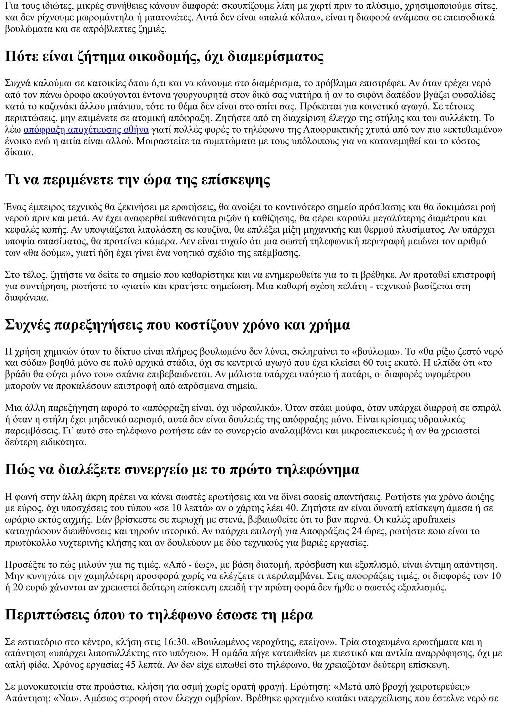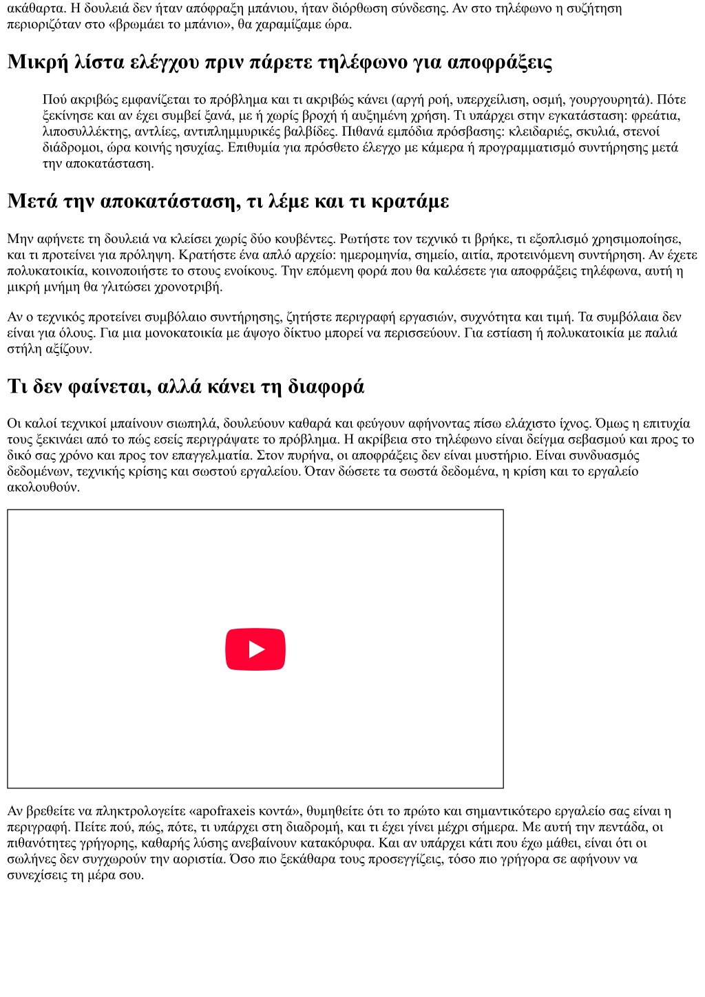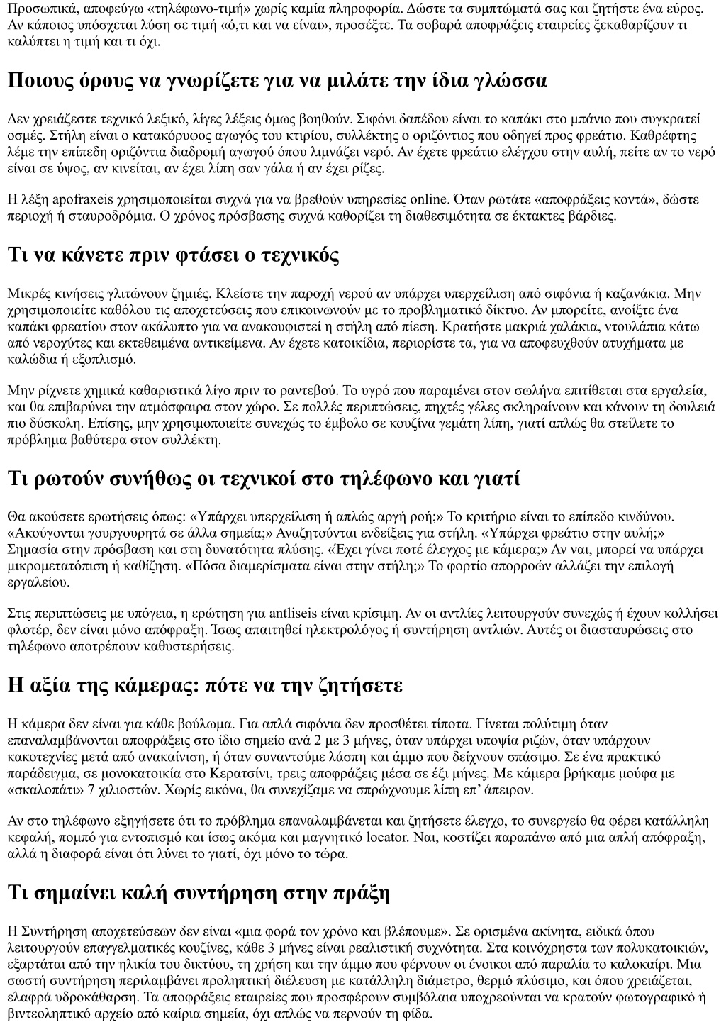ακάθαρτα. Η δουλειά δεν ήταν απόφραξη μπάνιου, ήταν διόρθωση σύνδεσης. Αν στο τηλέφωνο η συζήτηση περιοριζόταν στο «βρωμάει το μπάνιο», θα χαραμίζαμε ώρα. Μικρή λίστα ελέγχου πριν πάρετε τηλέφωνο για αποφράξεις Πού ακριβώς εμφανίζεται το πρόβλημα και τι ακριβώς κάνει (αργή ροή, υπερχείλιση, οσμή, γουργουρητά). Πότε ξεκίνησε και αν έχει συμβεί ξανά, με ή χωρίς βροχή ή αυξημένη χρήση. Τι υπάρχει στην εγκατάσταση: φρεάτια, λιποσυλλέκτης, αντλίες, αντιπλημμυρικές βαλβίδες. Πιθανά εμπόδια πρόσβασης: κλειδαριές, σκυλιά, στενοί διάδρομοι, ώρα κοινής ησυχίας. Επιθυμία για πρόσθετο έλεγχο με κάμερα ή προγραμματισμό συντήρησης μετά την αποκατάσταση. Μετά την αποκατάσταση, τι λέμε και τι κρατάμε Μην αφήνετε τη δουλειά να κλείσει χωρίς δύο κουβέντες. Ρωτήστε τον τεχνικό τι βρήκε, τι εξοπλισμό χρησιμοποίησε, και τι προτείνει για πρόληψη. Κρατήστε ένα απλό αρχείο: ημερομηνία, σημείο, αιτία, προτεινόμενη συντήρηση. Αν έχετε πολυκατοικία, κοινοποιήστε το στους ενοίκους. Την επόμενη φορά που θα καλέσετε για αποφράξεις τηλέφωνα, αυτή η μικρή μνήμη θα γλιτώσει χρονοτριβή. Αν ο τεχνικός προτείνει συμβόλαιο συντήρησης, ζητήστε περιγραφή εργασιών, συχνότητα και τιμή. Τα συμβόλαια δεν είναι για όλους. Για μια μονοκατοικία με άψογο δίκτυο μπορεί να περισσεύουν. Για εστίαση ή πολυκατοικία με παλιά στήλη αξίζουν. Τι δεν φαίνεται, αλλά κάνει τη διαφορά Οι καλοί τεχνικοί μπαίνουν σιωπηλά, δουλεύουν καθαρά και φεύγουν αφήνοντας πίσω ελάχιστο ίχνος. Όμως η επιτυχία τους ξεκινάει από το πώς εσείς περιγράψατε το πρόβλημα. Η ακρίβεια στο τηλέφωνο είναι δείγμα σεβασμού και προς το δικό σας χρόνο και προς τον επαγγελματία. Στον πυρήνα, οι αποφράξεις δεν είναι μυστήριο. Είναι συνδυασμός δεδομένων, τεχνικής κρίσης και σωστού εργαλείου. Όταν δώσετε τα σωστά δεδομένα, η κρίση και το εργαλείο ακολουθούν. Αν βρεθείτε να πληκτρολογείτε «apofraxeis κοντά», θυμηθείτε ότι το πρώτο και σημαντικότερο εργαλείο σας είναι η περιγραφή. Πείτε πού, πώς, πότε, τι υπάρχει στη διαδρομή, και τι έχει γίνει μέχρι σήμερα. Με αυτή την πεντάδα, οι πιθανότητες γρήγορης, καθαρής λύσης ανεβαίνουν κατακόρυφα. Και αν υπάρχει κάτι που έχω μάθει, είναι ότι οι σωλήνες δεν συγχωρούν την αοριστία. Όσο πιο ξεκάθαρα τους προσεγγίζεις, τόσο πιο γρήγορα σε αφήνουν να συνεχίσεις τη μέρα σου.
