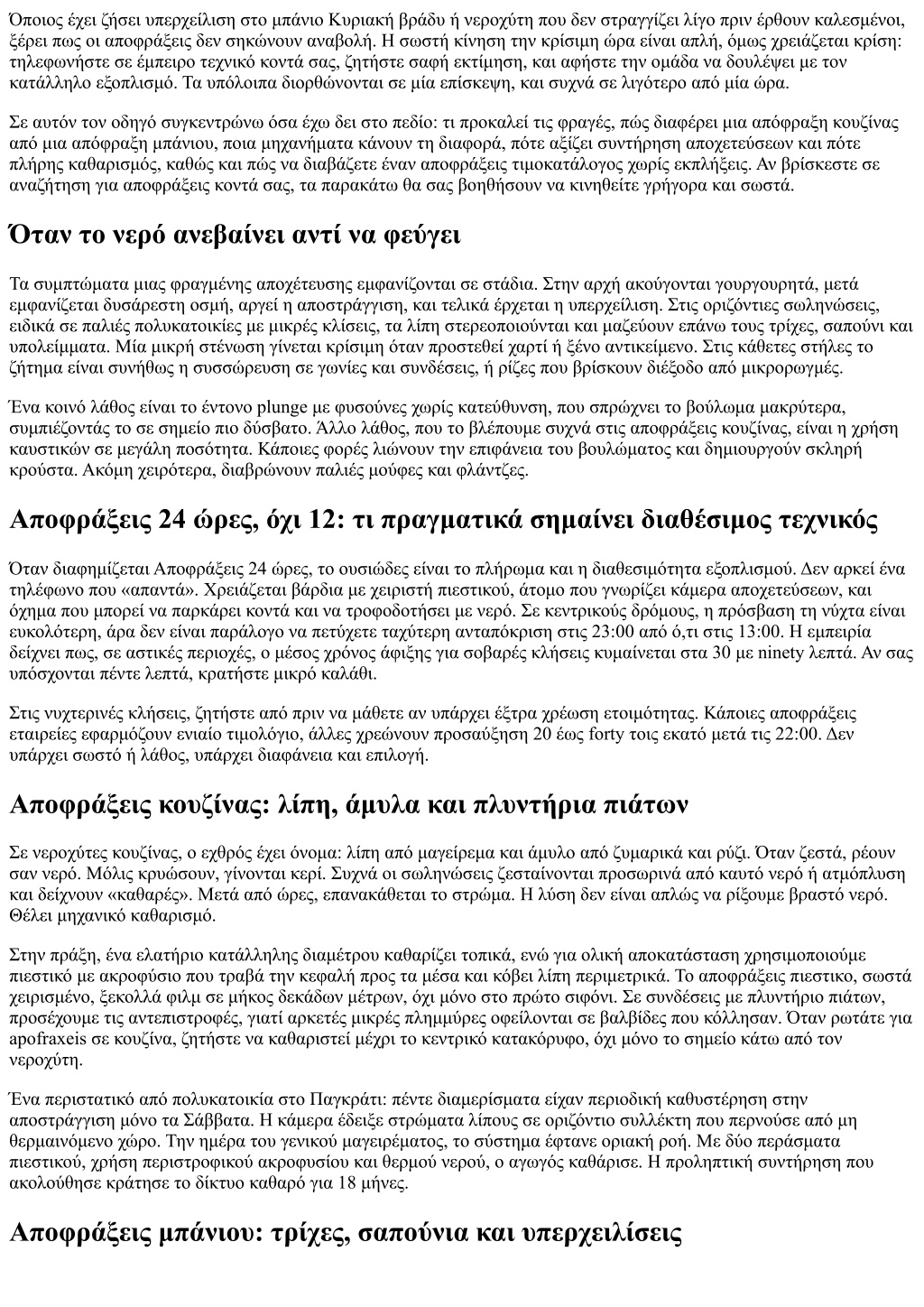 αλλά η συνέπεια στην απόκριση και η διαφάνεια σε τιμές δημιουργούν εμπιστοσύνη. Διαλέξτε με βάση την ποιότητα επαφής και την αποδεδειγμένη ικανότητα, όχι μόνο το company. Όταν με ένα τηλεφώνημα θέλετε λύση, όχι ραντεβού Ο στόχος είναι να επανέλθει η ροή. Όταν καλείτε, έχετε έτοιμες πληροφορίες. Διεύθυνση με στοιχεία πρόσβασης, είδος προβλήματος, τι δοκιμάσατε ήδη, ηλικία εγκατάστασης αν τη γνωρίζετε, και αν υπάρχει περιορισμένη πρόσβαση για όχημα. Ρωτήστε για διαθέσιμη ώρα άφιξης, πιθανή διάρκεια εργασίας, και αν θα χρειαστεί να κόψετε προσωρινά νερό ή ρεύμα. Ένας καλός τεχνικός θα σας οδηγήσει με σαφήνεια. Για σπίτια με μικρά παιδιά ή ηλικιωμένους, αξίζει να λύνετε τα γρήγορα: επαναφορά μιας λεκάνης ή ενός ντους είναι προτεραιότητα. Αν χρειαστεί δεύτερη επίσκεψη με κάμερα για συνολική αποτύπωση, ορίστε την σε ώρα που σας εξυπηρετεί. Το σημαντικό είναι να κερδίσετε λειτουργικότητα άμεσα. Μικρή, πρακτική λίστα ελέγχου πριν καλέσετε Περιγράψτε σύμπτωμα με ακρίβεια: ποιο σημείο δεν στραγγίζει, τι συμβαίνει όταν ανοίγετε νερό, τι όταν τραβάτε καζανάκι. Αναφέρετε τι δοκιμάσατε ήδη, ακόμη και αν ήταν απλό plunge ή καυστικό. Ρωτήστε για χρέωση νύχτας, χρήση πιεστικού, κάμερα και τυχόν εγγύηση. Εξασφαλίστε πρόσβαση: χώρος για όχημα, πέρασμα σωλήνων, καθαρός χώρος εργασίας. Έχετε τρόπο επικοινωνίας αν χρειαστούν φωτογραφίες ή βίντεο επιτόπου. Πόσο κοντά είναι αρκετά κοντά Η έννοια αποφράξεις κοντά έχει αξία λόγω χρόνου ανταπόκρισης και κόστους μετακίνησης. Ένα συνεργείο που κινείται στη γειτονιά σας γνωρίζει τους συνηθισμένους τύπους εγκατάστασης, τις ηλικίες των κτιρίων, και τα κοινά προβλήματα. Αυτό μειώνει χρόνο διάγνωσης. Επίσης, σε επαναληπτική επίσκεψη, η πρόσβαση είναι πιο εύκολη. Μην εγκλωβίζεστε όμως μόνο σε απόσταση. Μια ομάδα που έρχεται από λίγο μακρύτερα με σωστό εξοπλισμό είναι καλύτερη από μια πολύ κοντινή με περιορισμένα μέσα. Όταν η αποχέτευση επηρεάζει την υγεία του χώρου Τα λύματα μέσα σε κατοικία δεν είναι απλά ταλαιπωρία. Αυξάνουν υγρασία, ενεργοποιούν μούχλα, και μεταφέρουν βακτήρια. Η ταχεία παρέμβαση προστατεύει υλικά και ανθρώπους. Μετά από υπερχείλιση, ο σωστός καθαρισμός με απολυμαντικό είναι μέρος της εργασίας. Μην αφήνετε βρεγμένα ξύλα και σοβατεπί να στεγνώσουν μόνα τους. Η ζημιά θα εμφανιστεί σε μερικές εβδομάδες ως οσμή και παραμόρφωση. Στις πολυκατοικίες, οι αποφράξεις σε κοινόχρηστα απαιτούν συνεννόηση. Σφραγίστε προσωρινά σημεία υπερχείλισης, ενημερώστε διαμερίσματα που επηρεάζονται, και δώστε προτεραιότητα στον κύριο αγωγό. Ο τεχνικός που ξέρει να χειρίζεται ανθρώπους την ώρα της κρίσης αξίζει όσο και ο τεχνικός προβλήματα αποχέτευσης Αθηνών που χειρίζεται εξοπλισμό. Γιατί η πρώτη ώρα είναι η πιο σημαντική Τα περισσότερα φράγματα δεν βελτιώνονται με την αναμονή. Το νερό που στάθηκε στερεοποιεί λίπη και καθιστά τα βούλωματα πιο σκληρά. Αν χρειαστεί antliseis, όσο πιο νωρίς τόσο πιο μικρές οι ζημιές. Οι ρίζες, από την άλλη, δεν μεγαλώνουν μέσα σε μία νύχτα. Αλλά εκεί που υπάρχει υγρασία και τριχοειδές, θα ξαναγυρίσουν. Σχεδιάστε την οριστική λύση, αλλά κερδίστε πρώτα το παρόν. Όλα όσα θέλετε συγκεντρωμένα σε ένα τηλεφώνημα Όταν πληκτρολογείτε αποφράξεις τηλέφωνα, αναζητάτε κάτι συγκεκριμένο: άμεση ανταπόκριση, τεχνική επάρκεια, καθαρές τιμές, και συμβουλή που φαίνεται ανθρώπινη. Είτε επιλέξετε ένα μεγάλο σ