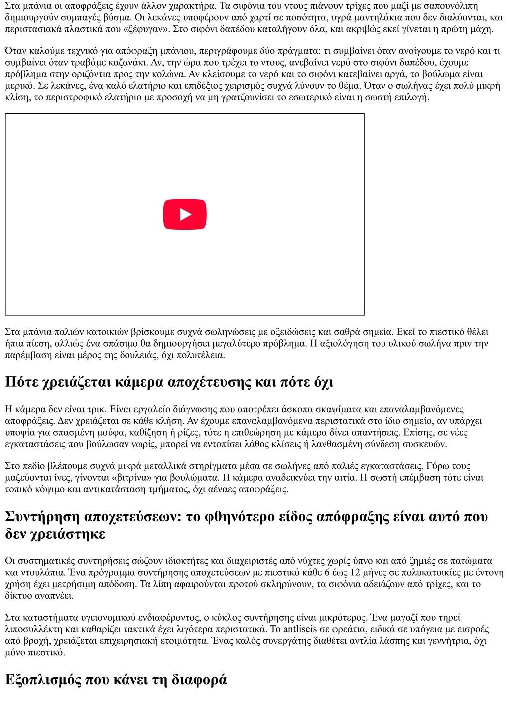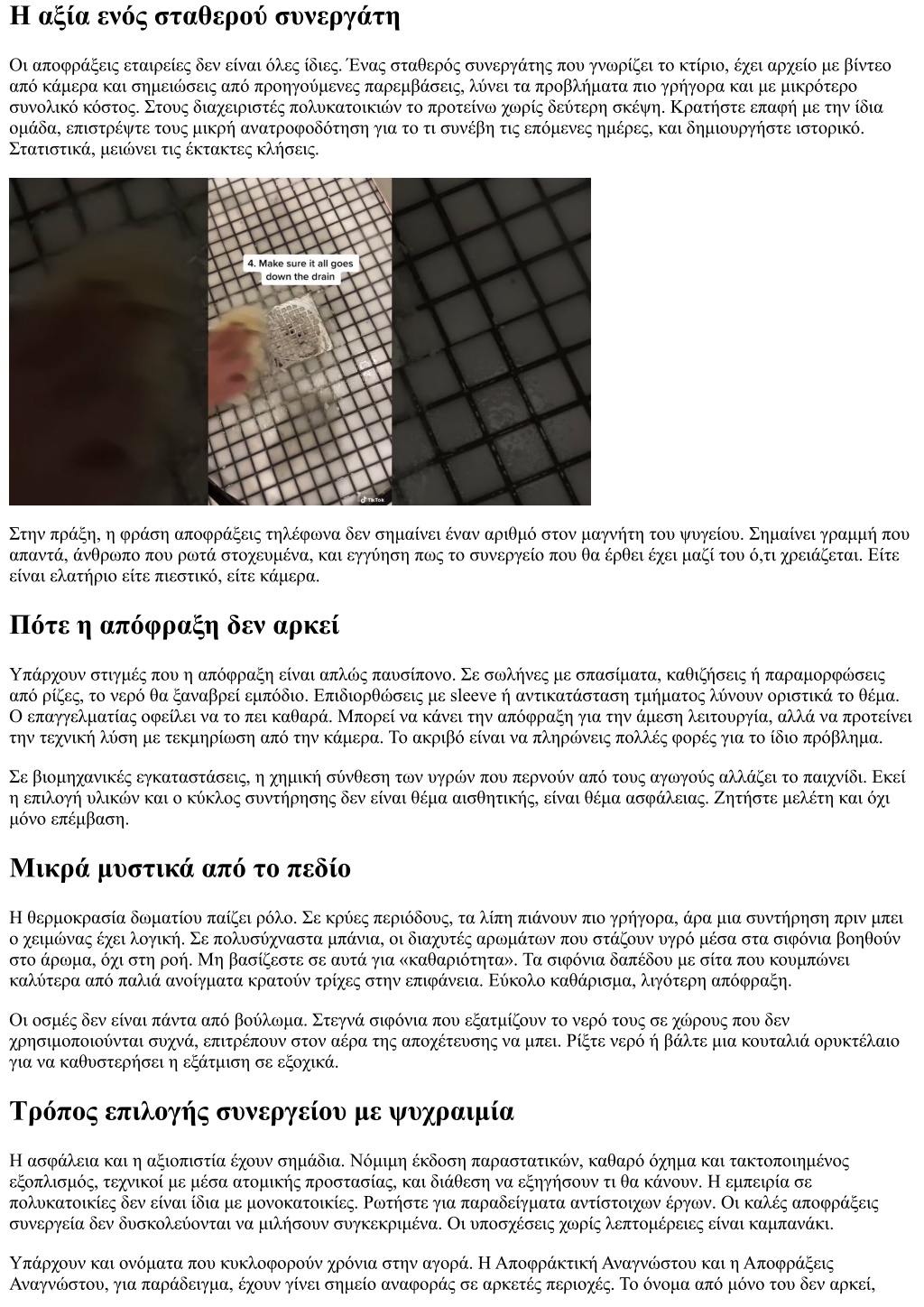 Η αξία ενός σταθερού συνεργάτη Οι αποφράξεις εταιρείες δεν είναι όλες ίδιες. Ένας σταθερός συνεργάτης που γνωρίζει το κτίριο, έχει αρχείο με βίντεο από κάμερα και σημειώσεις από προηγούμενες παρεμβάσεις, λύνει τα προβλήματα πιο γρήγορα και με μικρότερο συνολικό κόστος. Στους διαχειριστές πολυκατοικιών το προτείνω χωρίς δεύτερη σκέψη. Κρατήστε επαφή με την ίδια ομάδα, επιστρέψτε τους μικρή ανατροφοδότηση για το τι συνέβη τις επόμενες ημέρες, και δημιουργήστε ιστορικό. Στατιστικά, μειώνει τις έκτακτες κλήσεις. Στην πράξη, η φράση αποφράξεις τηλέφωνα δεν σημαίνει έναν αριθμό στον μαγνήτη του ψυγείου. Σημαίνει γραμμή που απαντά, άνθρωπο που ρωτά στοχευμένα, και εγγύηση πως το συνεργείο που θα έρθει έχει μαζί του ό,τι χρειάζεται. Είτε είναι ελατήριο είτε πιεστικό, είτε κάμερα. Πότε η απόφραξη δεν αρκεί Υπάρχουν στιγμές που η απόφραξη είναι απλώς παυσίπονο. Σε σωλήνες με σπασίματα, καθιζήσεις ή παραμορφώσεις από ρίζες, το νερό θα ξαναβρεί εμπόδιο. Επιδιορθώσεις με sleeve ή αντικατάσταση τμήματος λύνουν οριστικά το θέμα. Ο επαγγελματίας οφείλει να το πει καθαρά. Μπορεί να κάνει την απόφραξη για την άμεση λειτουργία, αλλά να προτείνει την τεχνική λύση με τεκμηρίωση από την κάμερα. Το ακριβό είναι να πληρώνεις πολλές φορές για το ίδιο πρόβλημα. Σε βιομηχανικές εγκαταστάσεις, η χημική σύνθεση των υγρών που περνούν από τους αγωγούς αλλάζει το παιχνίδι. Εκεί η επιλογή υλικών και ο κύκλος συντήρησης δεν είναι θέμα αισθητικής, είναι θέμα ασφάλειας. Ζητήστε μελέτη και όχι μόνο επέμβαση. Μικρά μυστικά από το πεδίο Η θερμοκρασία δωματίου παίζει ρόλο. Σε κρύες περιόδους, τα λίπη πιάνουν πιο γρήγορα, άρα μια συντήρηση πριν μπει ο χειμώνας έχει λογική. Σε πολυσύχναστα μπάνια, οι διαχυτές αρωμάτων που στάζουν υγρό μέσα στα σιφόνια βοηθούν στο άρωμα, όχι στη ροή. Μη βασίζεστε σε αυτά για «καθαριότητα». Τα σιφόνια δαπέδου με σίτα που κουμπώνει καλύτερα από παλιά ανοίγματα κρατούν τρίχες στην επιφάνεια. Εύκολο καθάρισμα, λιγότερη απόφραξη. Οι οσμές δεν είναι πάντα από βούλωμα. Στεγνά σιφόνια που εξατμίζουν το νερό τους σε χώρους που δεν χρησιμοποιούνται συχνά, επιτρέπουν στον αέρα της αποχέτευσης να μπει. Ρίξτε νερό ή βάλτε μια κουταλιά ορυκτέλαιο για να καθυστερήσει η εξάτμιση σε εξοχικά. Τρόπος επιλογής συνεργείου με ψυχραιμία Η ασφάλεια και η αξιοπιστία έχουν σημάδια. Νόμιμη έκδοση παραστατικών, καθαρό όχημα και τακτοποιημένος εξοπλισμός, τεχνικοί με μέσα ατομικής προστασίας, και διάθεση να εξηγήσουν τι θα κάνουν. Η εμπειρία σε πολυκατοικίες δεν είναι ίδια με μονοκατοικίες. Ρωτήστε για παραδείγματα αντίστοιχων έργων. Οι καλές αποφράξεις συνεργεία δεν δυσκολεύονται να μιλήσουν συγκεκριμένα. Οι υποσχέσεις χωρίς λεπτομέρειες είναι καμπανάκι. Υπάρχουν και ονόματα που κυκλοφορούν χρόνια στην αγορά. Η Αποφράκτική Αναγνώστου και η Αποφράξεις Αναγνώστου, για παράδειγμα, έχουν γίνει σημείο αναφοράς σε αρκετές περιοχές. Το όνομα από μόνο του δεν αρκεί,
