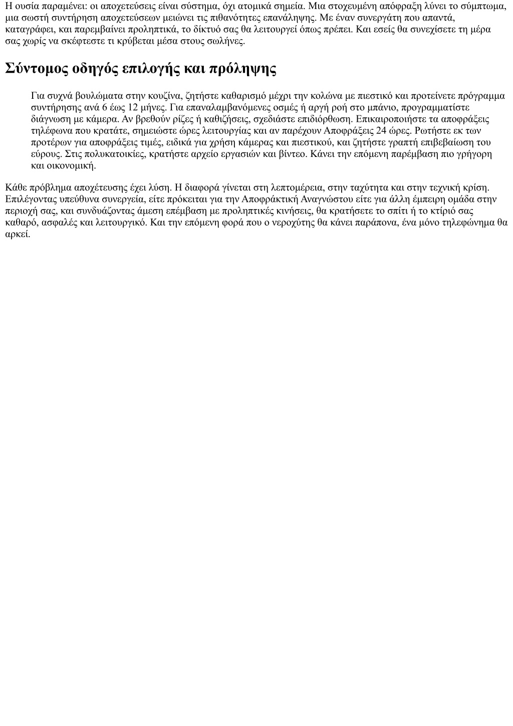 Η ουσία παραμένει: οι αποχετεύσεις είναι σύστημα, όχι ατομικά σημεία. Μια στοχευμένη απόφραξη λύνει το σύμπτωμα, μια σωστή συντήρηση αποχετεύσεων μειώνει τις πιθανότητες επανάληψης. Με έναν συνεργάτη που απαντά, καταγράφει, και παρεμβαίνει προληπτικά, το δίκτυό σας θα λειτουργεί όπως πρέπει. Και εσείς θα συνεχίσετε τη μέρα σας χωρίς να σκέφτεστε τι κρύβεται μέσα στους σωλήνες. Σύντομος οδηγός επιλογής και πρόληψης Για συχνά βουλώματα στην κουζίνα, ζητήστε καθαρισμό μέχρι την κολώνα με πιεστικό και προτείνετε πρόγραμμα συντήρησης ανά 6 έως 12 μήνες. Για επαναλαμβανόμενες οσμές ή αργή ροή στο μπάνιο, προγραμματίστε διάγνωση με κάμερα. Αν βρεθούν ρίζες ή καθιζήσεις, σχεδιάστε επιδιόρθωση. Επικαιροποιήστε τα αποφράξεις τηλέφωνα που κρατάτε, σημειώστε ώρες λειτουργίας και αν παρέχουν Αποφράξεις 24 ώρες. Ρωτήστε εκ των προτέρων για αποφράξεις τιμές, ειδικά για χρήση κάμερας και πιεστικού, και ζητήστε γραπτή επιβεβαίωση του εύρους. Στις πολυκατοικίες, κρατήστε αρχείο εργασιών και βίντεο. Κάνει την επόμενη παρέμβαση πιο γρήγορη και οικονομική. Κάθε πρόβλημα αποχέτευσης έχει λύση. Η διαφορά γίνεται στη λεπτομέρεια, στην ταχύτητα και στην τεχνική κρίση. Επιλέγοντας υπεύθυνα συνεργεία, είτε πρόκειται για την Αποφράκτική Αναγνώστου είτε για άλλη έμπειρη ομάδα στην περιοχή σας, και συνδυάζοντας άμεση επέμβαση με προληπτικές κινήσεις, θα κρατήσετε το σπίτι ή το κτίριό σας καθαρό, ασφαλές και λειτουργικό. Και την επόμενη φορά που ο νεροχύτης θα κάνει παράπονα, ένα μόνο τηλεφώνημα θα αρκεί.