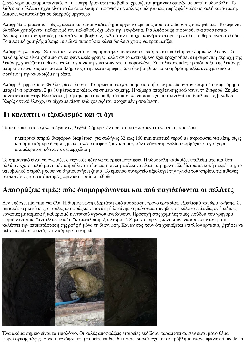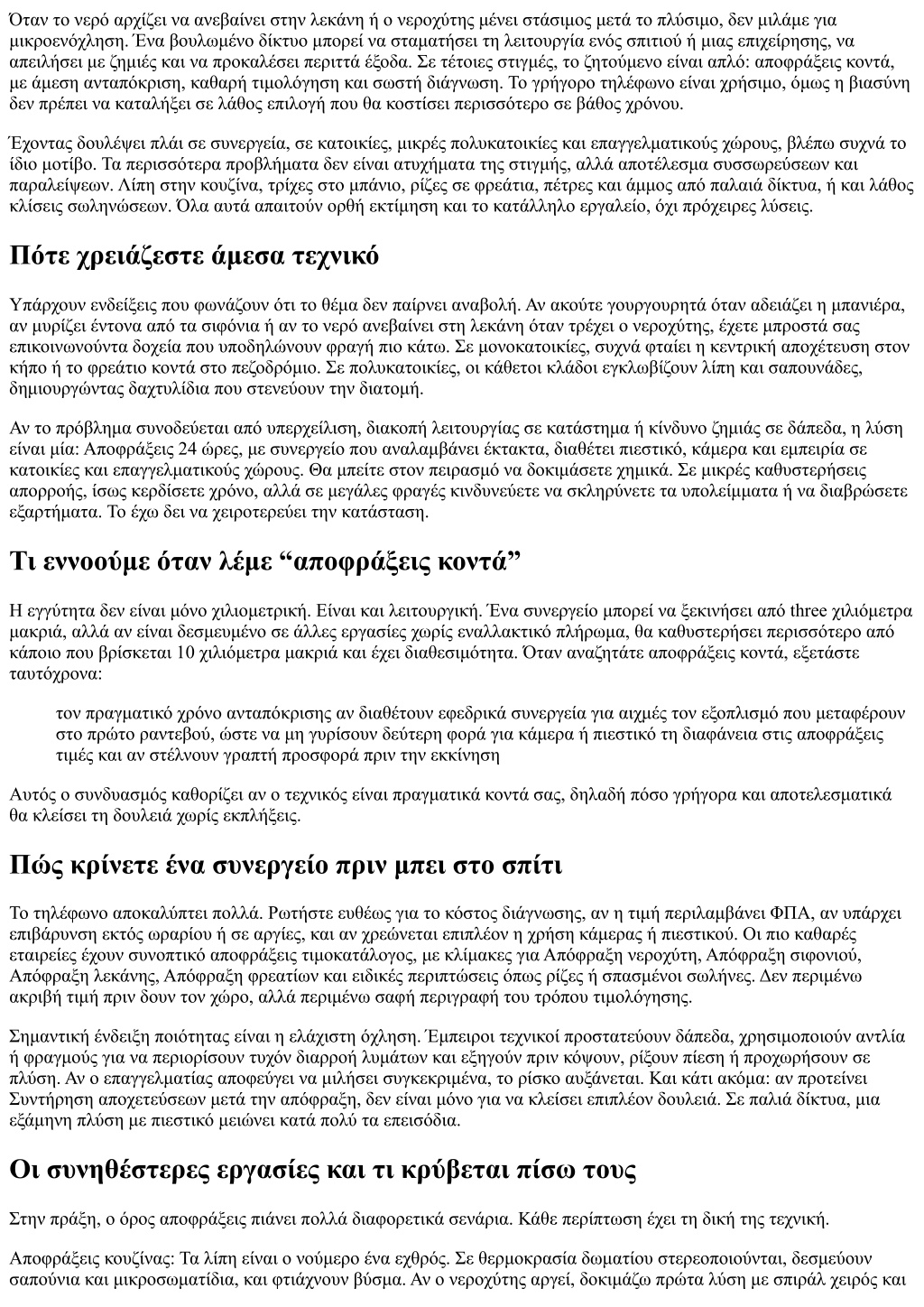 affordable time frame. Σε επαγγελματικούς χώρους, αυτό είναι υποχρεωτικό, ιδίως όταν ο έλεγχος υγιεινής παρακολουθεί αποχετεύσεις. Αποφράξεις 24 ώρες: πότε αξίζει το εκτός ωραρίου Η νυχτερινή κλήση ή Κυριακή πρωί έχει προσαύξηση. Δεν είναι πάντα αναπόφευκτη. Αν το νερό απλώς αργεί, ίσως αντέξει μέχρι το πρωί με προσωρινά μέτρα. Αν όμως υπάρχει υπερχείλιση, κακή οσμή που δεν υποχωρεί ή κίνδυνος για χαμηλά διαμερίσματα, το εκτός ωραρίου αξίζει. Οι σοβαρές αποφράξεις εταιρείες έχουν γραμμές αποφράξεις τηλέφωνα με πραγματικό συντονιστή, όχι μόνο αυτόματο μήνυμα. Ζητήστε εκτίμηση χρόνου άφιξης, ακόμα κι αν ο τεχνικός είναι σε άλλη δουλειά. Το “έρχομαι τώρα” χωρίς εκτίμηση συχνά καταλήγει σε αναμονή. Ποιοι είναι οι κίνδυνοι του “κάν’ το μόνος σου” Δεν είμαι κατά του DIY, αρκεί να γνωρίζετε τα όριά του. Η αντλία κενού για έμβολο, ο καθαρισμός σιφωνιών, και το ζεστό νερό με απορρυπαντικό είναι ασφαλείς πρώτες κινήσεις. Από εκεί και πέρα, τα εμπορικά χημικά είναι δίκοπο μαχαίρι. Λιώνουν οργανικά υπολείμματα, αλλά δεν κάνουν τίποτα σε σκουριά, άμμο ή αντικείμενα, ενώ παράγουν θερμότητα που μπορεί να παραμορφώσει πλαστικούς σωλήνες ή να καταστρέψει φλάντζες. Το χειροκίνητο σπιράλ, αν δεν καθοδηγηθεί σωστά, μπορεί να φύγει από καμπύλες, να γρατσουνίσει και να μπλεχτεί. Στον αντίποδα, ένα μικρό σπιράλ 5 με 7 μέτρα, προσεκτικά, σώζει την κατάσταση σε πολλά σιφόνια. Αν χρειαστείτε τελικά συνεργείο μετά από DIY, ενημερώστε τους για ό,τι ρίξατε στον σωλήνα. Η επαφή με χημικά μπορεί να είναι επικίνδυνη για εκείνους, και θα καθορίσει τον τρόπο που θα δουλέψουν. Από την διάγνωση στην πρόληψη: Συντήρηση αποχετεύσεων Εκεί που κερδίζεται το παιχνίδι είναι στην πρόληψη. Δεν μιλάμε για πολυτέλεια. Σε κτίρια με πέτρινα ή πήλινα δίκτυα και σε χώρους εστίασης, η προληπτική πλύση δίνει διάρκεια. Μια προγραμματισμένη Συντήρηση αποχετεύσεων ανά 6 με 12 μήνες με πιεστικό καθαρίζει τα τοιχώματα και απομακρύνει συσσωρεύσεις πριν γίνουν βύσματα. Σε μικρές πολυκατοικίες, το κόστος μοιράζεται και παραμένει λογικό, ειδικά αν είναι μέρος σύμβασης. Συχνά συνδυάζεται με επιθεώρηση κάμερας σε δύσκολα σημεία, ώστε να έχουμε ιστορικό για μελλοντική σύγκριση. Ένα παράδειγμα από γραφείο 70 τ.μ. στο κέντρο: κάθε τέσσερις μήνες πλύση με χαμηλή πίεση στην κατακόρυφη της κουζίνας κρατάει το δίκτυο καθαρό, χωρίς ακραίες χρεώσεις και χωρίς να κλείνουμε γραμμές. Όταν κάποτε αμελήθηκε για 14 μήνες, η επέμβαση χρειάστηκε δύο εργαλεία και διπλάσιο χρόνο. Πότε χρειάζεται κάμερα και πότε είναι υπερβολή Το βίντεο βοηθάει όταν έχουμε επαναλαμβανόμενα φρακάρια στο ίδιο σημείο, περίεργους ήχους, διπλές φραγές ή υποψία για σπάσιμο. Στα φρεάτια, οι ρίζες που μπήκαν από αρμούς φαίνονται. Σε παλιά κτίρια, η κάμερα εντοπίζει καθιζήσεις και κάνει διαφορά στις αποφάσεις. Αν όμως μιλάμε για προφανή βούλωμα νεροχύτη από λίπη χωρίς ιστορικό, η κάμερα είναι περιττή. Εκεί που πρέπει να επιμένετε είναι να σας δοθεί, αν γίνεται, στιγμιότυπο ή αναφορά, ιδίως αν πρόκειται για πρόταση αντικατάστασης σωλήνα. Τα βίντεο δεν είναι πάντα τέλεια, αλλά δίνουν πλαίσιο. Επιλογή ανάμεσα σε αποφράξεις συνεργεία και μεμονωμένους τεχνικούς Τα αποφράξεις συνεργεία έχουν πλεονέκτημα στην διαθεσιμότητα, στον εξοπλισμό και στην ταχύτητα σε μεγάλα έργα. Συχνά διαθέτουν δύο πληρώματα, οπότε αν κολλήσει η μια ομάδα, έρχεται δεύτερη. Από την 