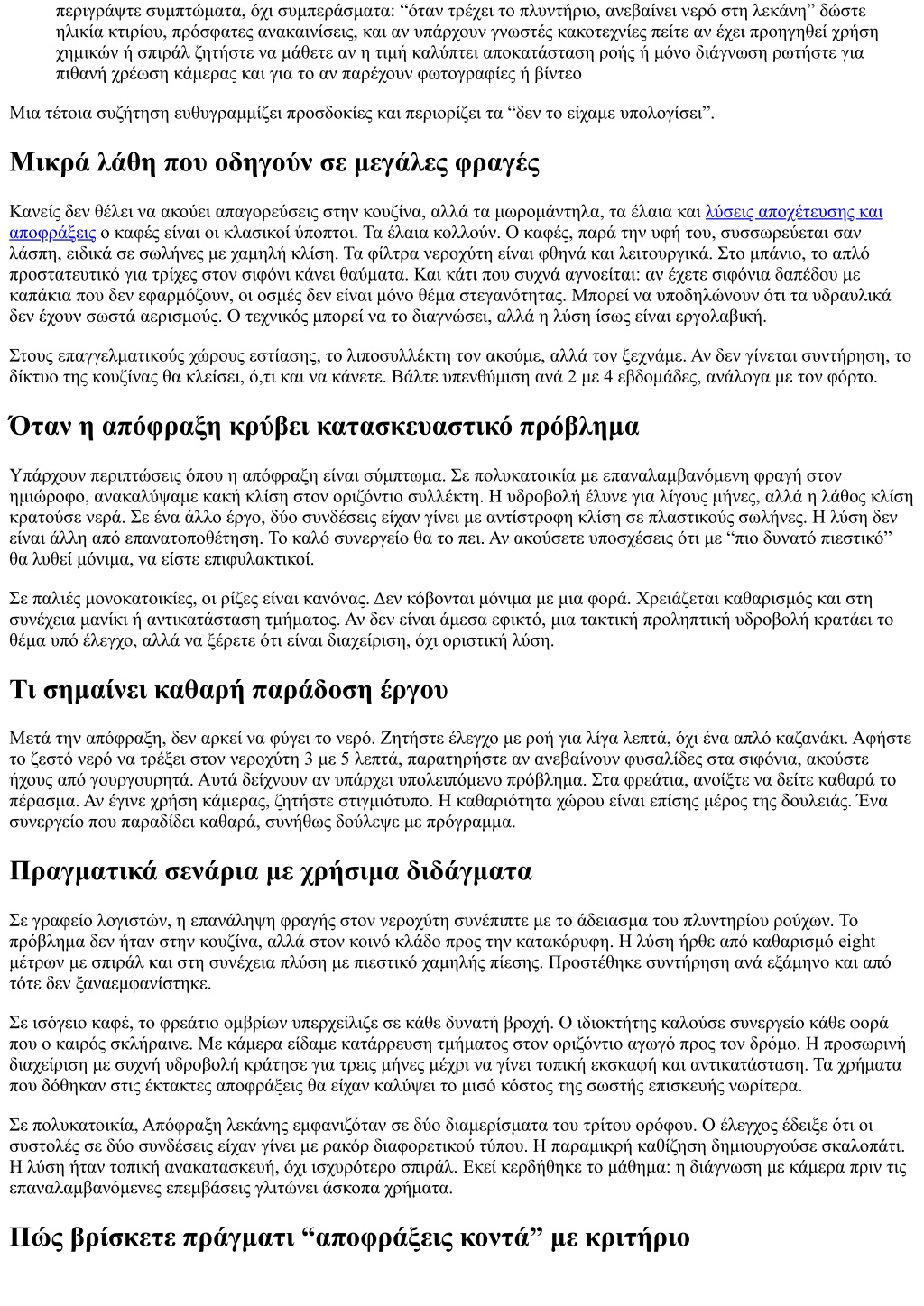 περιγράψτε συμπτώματα, όχι συμπεράσματα: “όταν τρέχει το πλυντήριο, ανεβαίνει νερό στη λεκάνη” δώστε ηλικία κτιρίου, πρόσφατες ανακαινίσεις, και αν υπάρχουν γνωστές κακοτεχνίες πείτε αν έχει προηγηθεί χρήση χημικών ή σπιράλ ζητήστε να μάθετε αν η τιμή καλύπτει αποκατάσταση ροής ή μόνο διάγνωση ρωτήστε για πιθανή χρέωση κάμερας και για το αν παρέχουν φωτογραφίες ή βίντεο Μια τέτοια συζήτηση ευθυγραμμίζει προσδοκίες και περιορίζει τα “δεν το είχαμε υπολογίσει”. Μικρά λάθη που οδηγούν σε μεγάλες φραγές Κανείς δεν θέλει να ακούει απαγορεύσεις στην κουζίνα, αλλά τα μωρομάντηλα, τα έλαια και λύσεις αποχέτευσης και αποφράξεις ο καφές είναι οι κλασικοί ύποπτοι. Τα έλαια κολλούν. Ο καφές, παρά την υφή του, συσσωρεύεται σαν λάσπη, ειδικά σε σωλήνες με χαμηλή κλίση. Τα φίλτρα νεροχύτη είναι φθηνά και λειτουργικά. Στο μπάνιο, το απλό προστατευτικό για τρίχες στον σιφόνι κάνει θαύματα. Και κάτι που συχνά αγνοείται: αν έχετε σιφόνια δαπέδου με καπάκια που δεν εφαρμόζουν, οι οσμές δεν είναι μόνο θέμα στεγανότητας. Μπορεί να υποδηλώνουν ότι τα υδραυλικά δεν έχουν σωστά αερισμούς. Ο τεχνικός μπορεί να το διαγνώσει, αλλά η λύση ίσως είναι εργολαβική. Στους επαγγελματικούς χώρους εστίασης, το λιποσυλλέκτη τον ακούμε, αλλά τον ξεχνάμε. Αν δεν γίνεται συντήρηση, το δίκτυο της κουζίνας θα κλείσει, ό,τι και να κάνετε. Βάλτε υπενθύμιση ανά 2 με 4 εβδομάδες, ανάλογα με τον φόρτο. Όταν η απόφραξη κρύβει κατασκευαστικό πρόβλημα Υπάρχουν περιπτώσεις όπου η απόφραξη είναι σύμπτωμα. Σε πολυκατοικία με επαναλαμβανόμενη φραγή στον ημιώροφο, ανακαλύψαμε κακή κλίση στον οριζόντιο συλλέκτη. Η υδροβολή έλυνε για λίγους μήνες, αλλά η λάθος κλίση κρατούσε νερά. Σε ένα άλλο έργο, δύο συνδέσεις είχαν γίνει με αντίστροφη κλίση σε πλαστικούς σωλήνες. Η λύση δεν είναι άλλη από επανατοποθέτηση. Το καλό συνεργείο θα το πει. Αν ακούσετε υποσχέσεις ότι με “πιο δυνατό πιεστικό” θα λυθεί μόνιμα, να είστε επιφυλακτικοί. Σε παλιές μονοκατοικίες, οι ρίζες είναι κανόνας. Δεν κόβονται μόνιμα με μια φορά. Χρειάζεται καθαρισμός και στη συνέχεια μανίκι ή αντικατάσταση τμήματος. Αν δεν είναι άμεσα εφικτό, μια τακτική προληπτική υδροβολή κρατάει το θέμα υπό έλεγχο, αλλά να ξέρετε ότι είναι διαχείριση, όχι οριστική λύση. Τι σημαίνει καθαρή παράδοση έργου Μετά την απόφραξη, δεν αρκεί να φύγει το νερό. Ζητήστε έλεγχο με ροή για λίγα λεπτά, όχι ένα απλό καζανάκι. Αφήστε το ζεστό νερό να τρέξει στον νεροχύτη 3 με 5 λεπτά, παρατηρήστε αν ανεβαίνουν φυσαλίδες στα σιφόνια, ακούστε ήχους από γουργουρητά. Αυτά δείχνουν αν υπάρχει υπολειπόμενο πρόβλημα. Στα φρεάτια, ανοίξτε να δείτε καθαρά το πέρασμα. Αν έγινε χρήση κάμερας, ζητήστε στιγμιότυπο. Η καθαριότητα χώρου είναι επίσης μέρος της δουλειάς. Ένα συνεργείο που παραδίδει καθαρά, συνήθως δούλεψε με πρόγραμμα. Πραγματικά σενάρια με χρήσιμα διδάγματα Σε γραφείο λογιστών, η επανάληψη φραγής στον νεροχύτη συνέπιπτε με το άδειασμα του πλυντηρίου ρούχων. Το πρόβλημα δεν ήταν στην κουζίνα, αλλά στον κοινό κλάδο προς την κατακόρυφη. Η λύση ήρθε από καθαρισμό eight μέτρων με σπιράλ και στη συνέχεια πλύση με πιεστικό χαμηλής πίεσης. Προστέθηκε συντήρηση ανά εξάμηνο και από τότε δεν ξαναεμφανίστηκε. Σε ισόγειο καφέ, το φρεάτιο ομβρίων υπερχείλιζε σε κάθε δυνατή βροχή. Ο ιδιοκτήτης καλούσε συνεργείο κάθε φορά που ο καιρός σκλήραινε. Με κάμερα είδαμε κατάρρευσ