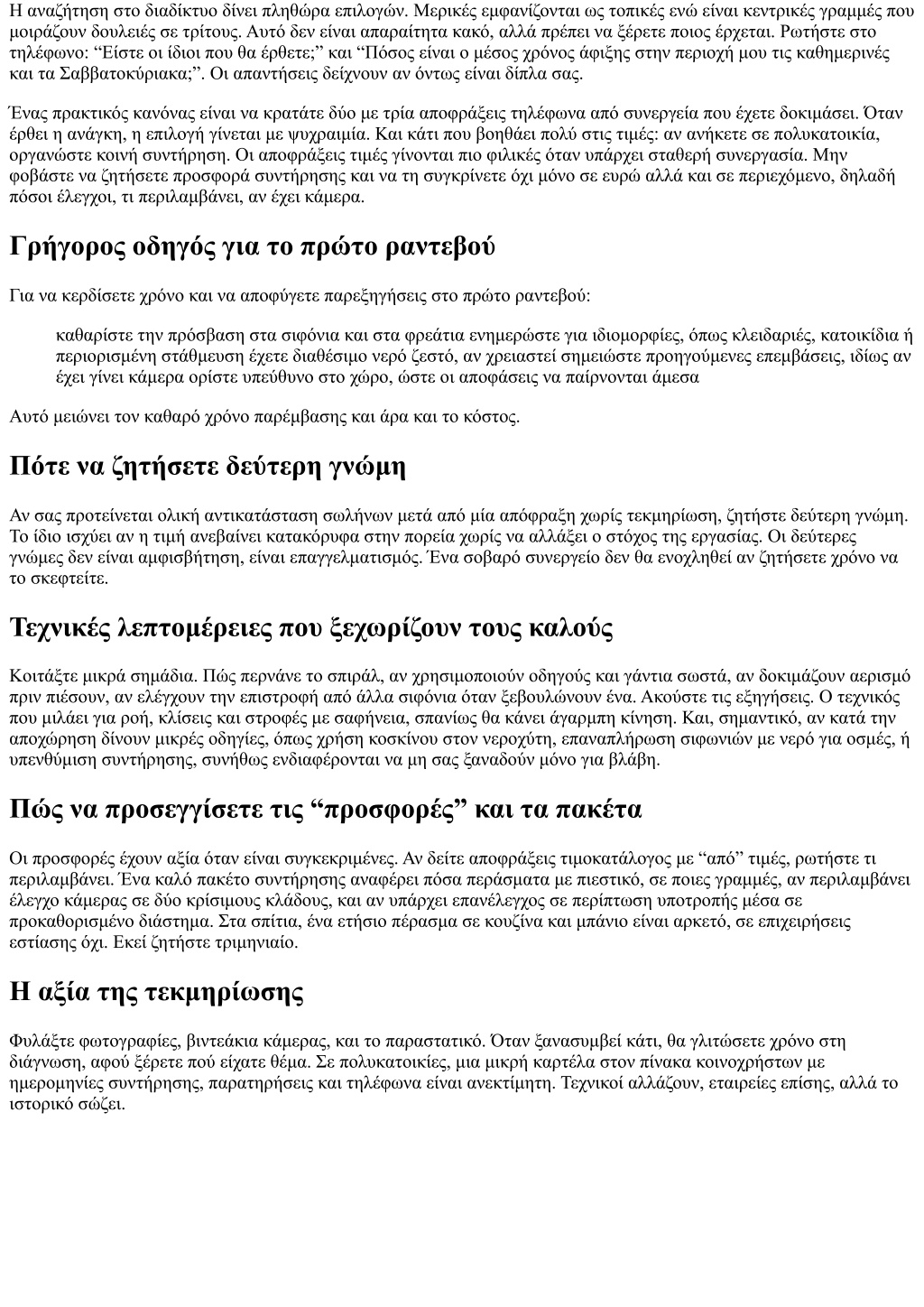 Η αναζήτηση στο διαδίκτυο δίνει πληθώρα επιλογών. Μερικές εμφανίζονται ως τοπικές ενώ είναι κεντρικές γραμμές που μοιράζουν δουλειές σε τρίτους. Αυτό δεν είναι απαραίτητα κακό, αλλά πρέπει να ξέρετε ποιος έρχεται. Ρωτήστε στο τηλέφωνο: “Είστε οι ίδιοι που θα έρθετε;” και “Πόσος είναι ο μέσος χρόνος άφιξης στην περιοχή μου τις καθημερινές και τα Σαββατοκύριακα;”. Οι απαντήσεις δείχνουν αν όντως είναι δίπλα σας. Ένας πρακτικός κανόνας είναι να κρατάτε δύο με τρία αποφράξεις τηλέφωνα από συνεργεία που έχετε δοκιμάσει. Όταν έρθει η ανάγκη, η επιλογή γίνεται με ψυχραιμία. Και κάτι που βοηθάει πολύ στις τιμές: αν ανήκετε σε πολυκατοικία, οργανώστε κοινή συντήρηση. Οι αποφράξεις τιμές γίνονται πιο φιλικές όταν υπάρχει σταθερή συνεργασία. Μην φοβάστε να ζητήσετε προσφορά συντήρησης και να τη συγκρίνετε όχι μόνο σε ευρώ αλλά και σε περιεχόμενο, δηλαδή πόσοι έλεγχοι, τι περιλαμβάνει, αν έχει κάμερα. Γρήγορος οδηγός για το πρώτο ραντεβού Για να κερδίσετε χρόνο και να αποφύγετε παρεξηγήσεις στο πρώτο ραντεβού: καθαρίστε την πρόσβαση στα σιφόνια και στα φρεάτια ενημερώστε για ιδιομορφίες, όπως κλειδαριές, κατοικίδια ή περιορισμένη στάθμευση έχετε διαθέσιμο νερό ζεστό, αν χρειαστεί σημειώστε προηγούμενες επεμβάσεις, ιδίως αν έχει γίνει κάμερα ορίστε υπεύθυνο στο χώρο, ώστε οι αποφάσεις να παίρνονται άμεσα Αυτό μειώνει τον καθαρό χρόνο παρέμβασης και άρα και το κόστος. Πότε να ζητήσετε δεύτερη γνώμη Αν σας προτείνεται ολική αντικατάσταση σωλήνων μετά από μία απόφραξη χωρίς τεκμηρίωση, ζητήστε δεύτερη γνώμη. Το ίδιο ισχύει αν η τιμή ανεβαίνει κατακόρυφα στην πορεία χωρίς να αλλάξει ο στόχος της εργασίας. Οι δεύτερες γνώμες δεν είναι αμφισβήτηση, είναι επαγγελματισμός. Ένα σοβαρό συνεργείο δεν θα ενοχληθεί αν ζητήσετε χρόνο να το σκεφτείτε. Τεχνικές λεπτομέρειες που ξεχωρίζουν τους καλούς Κοιτάξτε μικρά σημάδια. Πώς περνάνε το σπιράλ, αν χρησιμοποιούν οδηγούς και γάντια σωστά, αν δοκιμάζουν αερισμό πριν πιέσουν, αν ελέγχουν την επιστροφή από άλλα σιφόνια όταν ξεβουλώνουν ένα. Ακούστε τις εξηγήσεις. Ο τεχνικός που μιλάει για ροή, κλίσεις και στροφές με σαφήνεια, σπανίως θα κάνει άγαρμπη κίνηση. Και, σημαντικό, αν κατά την αποχώρηση δίνουν μικρές οδηγίες, όπως χρήση κοσκίνου στον νεροχύτη, επαναπλήρωση σιφωνιών με νερό για οσμές, ή υπενθύμιση συντήρησης, συνήθως ενδιαφέρονται να μη σας ξαναδούν μόνο για βλάβη. Πώς να προσεγγίσετε τις “προσφορές” και τα πακέτα Οι προσφορές έχουν αξία όταν είναι συγκεκριμένες. Αν δείτε αποφράξεις τιμοκατάλογος με “από” τιμές, ρωτήστε τι περιλαμβάνει. Ένα καλό πακέτο συντήρησης αναφέρει πόσα περάσματα με πιεστικό, σε ποιες γραμμές, αν περιλαμβάνει έλεγχο κάμερας σε δύο κρίσιμους κλάδους, και αν υπάρχει επανέλεγχος σε περίπτωση υποτροπής μέσα σε προκαθορισμένο διάστημα. Στα σπίτια, ένα ετήσιο πέρασμα σε κουζίνα και μπάνιο είναι αρκετό, σε επιχειρήσεις εστίασης όχι. Εκεί ζητήστε τριμηνιαίο. Η αξία της τεκμηρίωσης Φυλάξτε φωτογραφίες, βιντεάκια κάμερας, και το παραστατικό. Όταν ξανασυμβεί κάτι, θα γλιτώσετε χρόνο στη διάγνωση, αφού ξέρετε πού είχατε θέμα. Σε πολυκατοικίες, μια μικρή καρτέλα στον πίνακα κοινοχρήστων με ημερομηνίες συντήρησης, παρατηρήσεις και τηλέφωνα είναι ανεκτίμητη. Τεχνικοί αλλάζουν, εταιρείες επίσης, αλλά το ιστορικό σώζει.