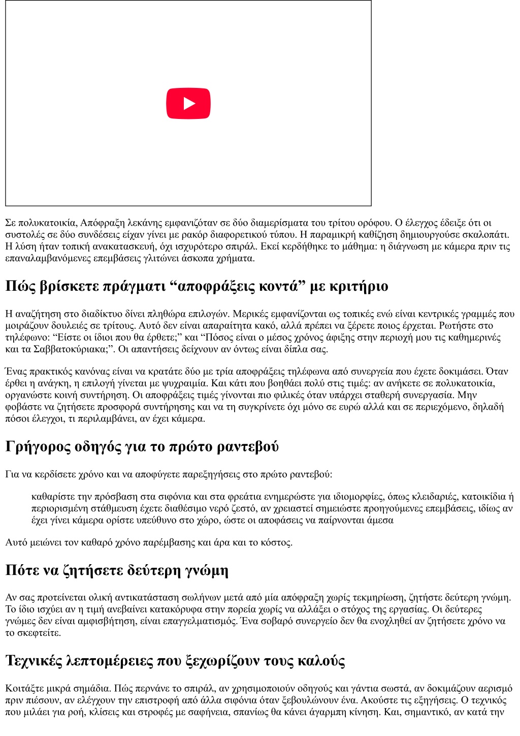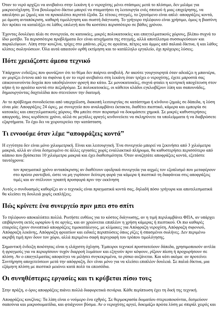 Σε πολυκατοικία, Απόφραξη λεκάνης εμφανιζόταν σε δύο διαμερίσματα του τρίτου ορόφου. Ο έλεγχος έδειξε ότι οι συστολές σε δύο συνδέσεις είχαν γίνει με ρακόρ διαφορετικού τύπου. Η παραμικρή καθίζηση δημιουργούσε σκαλοπάτι. Η λύση ήταν τοπική ανακατασκευή, όχι ισχυρότερο σπιράλ. Εκεί κερδήθηκε το μάθημα: η διάγνωση με κάμερα πριν τις επαναλαμβανόμενες επεμβάσεις γλιτώνει άσκοπα χρήματα. Πώς βρίσκετε πράγματι “αποφράξεις κοντά” με κριτήριο Η αναζήτηση στο διαδίκτυο δίνει πληθώρα επιλογών. Μερικές εμφανίζονται ως τοπικές ενώ είναι κεντρικές γραμμές που μοιράζουν δουλειές σε τρίτους. Αυτό δεν είναι απαραίτητα κακό, αλλά πρέπει να ξέρετε ποιος έρχεται. Ρωτήστε στο τηλέφωνο: “Είστε οι ίδιοι που θα έρθετε;” και “Πόσος είναι ο μέσος χρόνος άφιξης στην περιοχή μου τις καθημερινές και τα Σαββατοκύριακα;”. Οι απαντήσεις δείχνουν αν όντως είναι δίπλα σας. Ένας πρακτικός κανόνας είναι να κρατάτε δύο με τρία αποφράξεις τηλέφωνα από συνεργεία που έχετε δοκιμάσει. Όταν έρθει η ανάγκη, η επιλογή γίνεται με ψυχραιμία. Και κάτι που βοηθάει πολύ στις τιμές: αν ανήκετε σε πολυκατοικία, οργανώστε κοινή συντήρηση. Οι αποφράξεις τιμές γίνονται πιο φιλικές όταν υπάρχει σταθερή συνεργασία. Μην φοβάστε να ζητήσετε προσφορά συντήρησης και να τη συγκρίνετε όχι μόνο σε ευρώ αλλά και σε περιεχόμενο, δηλαδή πόσοι έλεγχοι, τι περιλαμβάνει, αν έχει κάμερα. Γρήγορος οδηγός για το πρώτο ραντεβού Για να κερδίσετε χρόνο και να αποφύγετε παρεξηγήσεις στο πρώτο ραντεβού: καθαρίστε την πρόσβαση στα σιφόνια και στα φρεάτια ενημερώστε για ιδιομορφίες, όπως κλειδαριές, κατοικίδια ή περιορισμένη στάθμευση έχετε διαθέσιμο νερό ζεστό, αν χρειαστεί σημειώστε προηγούμενες επεμβάσεις, ιδίως αν έχει γίνει κάμερα ορίστε υπεύθυνο στο χώρο, ώστε οι αποφάσεις να παίρνονται άμεσα Αυτό μειώνει τον καθαρό χρόνο παρέμβασης και άρα και το κόστος. Πότε να ζητήσετε δεύτερη γνώμη Αν σας προτείνεται ολική αντικατάσταση σωλήνων μετά από μία απόφραξη χωρίς τεκμηρίωση, ζητήστε δεύτερη γνώμη. Το ίδιο ισχύει αν η τιμή ανεβαίνει κατακόρυφα στην πορεία χωρίς να αλλάξει ο στόχος της εργασίας. Οι δεύτερες γνώμες δεν είναι αμφισβήτηση, είναι επαγγελματισμός. Ένα σοβαρό συνεργείο δεν θα ενοχληθεί αν ζητήσετε χρόνο να το σκεφτείτε. Τεχνικές λεπτομέρειες που ξεχωρίζουν τους καλούς Κοιτάξτε μικρά σημάδια. Πώς περνάνε το σπιράλ, αν χρησιμοποιούν οδηγούς και γάντια σωστά, αν δοκιμάζουν αερισμό πριν πιέσουν, αν ελέγχουν την επιστροφή από άλλα σιφόνια όταν ξεβουλώνουν ένα. Ακούστε τις εξηγήσεις. Ο τεχνικός που μιλάει για ροή, κλίσεις και στροφές με σαφήνεια, σπανίως θα κάνει άγαρμπη κίνηση. Και, σημαντικό, αν κατά την