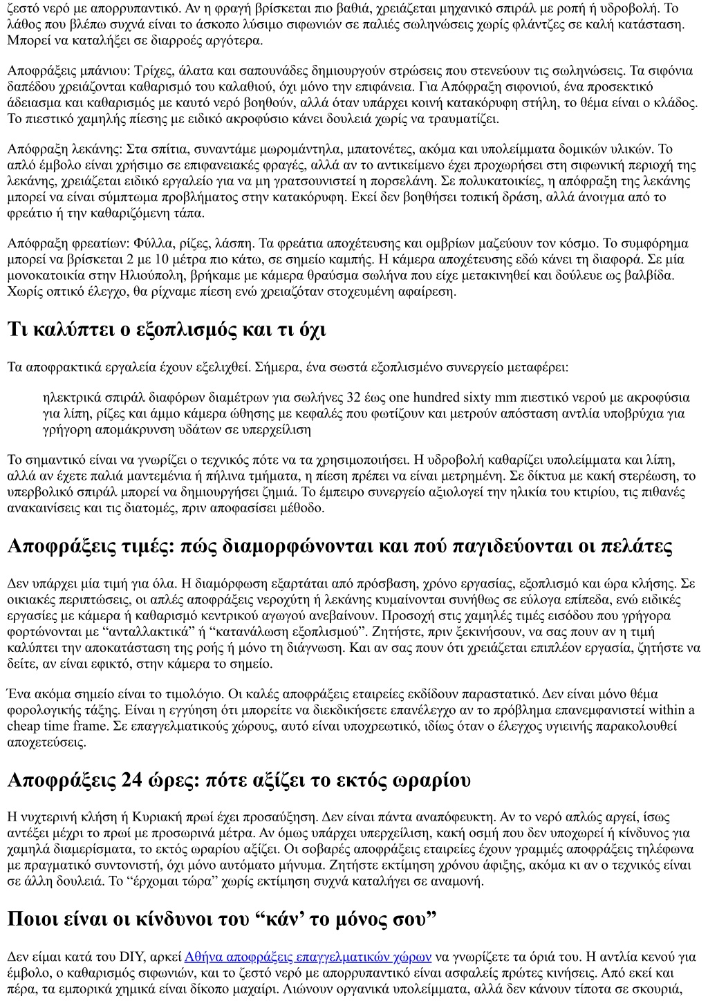 άμμο ή αντικείμενα, ενώ παράγουν θερμότητα που μπορεί να παραμορφώσει πλαστικούς σωλήνες ή να καταστρέψει φλάντζες. Το χειροκίνητο σπιράλ, αν δεν καθοδηγηθεί σωστά, μπορεί να φύγει από καμπύλες, να γρατσουνίσει και να μπλεχτεί. Στον αντίποδα, ένα μικρό σπιράλ 5 με 7 μέτρα, προσεκτικά, σώζει την κατάσταση σε πολλά σιφόνια. Αν χρειαστείτε τελικά συνεργείο μετά από DIY, ενημερώστε τους για ό,τι ρίξατε στον σωλήνα. Η επαφή με χημικά μπορεί να είναι επικίνδυνη για εκείνους, και θα καθορίσει τον τρόπο που θα δουλέψουν. Από την διάγνωση στην πρόληψη: Συντήρηση αποχετεύσεων Εκεί που κερδίζεται το παιχνίδι είναι στην πρόληψη. Δεν μιλάμε για πολυτέλεια. Σε κτίρια με πέτρινα ή πήλινα δίκτυα και σε χώρους εστίασης, η προληπτική πλύση δίνει διάρκεια. Μια προγραμματισμένη Συντήρηση αποχετεύσεων ανά 6 με 12 μήνες με πιεστικό καθαρίζει τα τοιχώματα και απομακρύνει συσσωρεύσεις πριν γίνουν βύσματα. Σε μικρές πολυκατοικίες, το κόστος μοιράζεται και παραμένει λογικό, ειδικά αν είναι μέρος σύμβασης. Συχνά συνδυάζεται με επιθεώρηση κάμερας σε δύσκολα σημεία, ώστε να έχουμε ιστορικό για μελλοντική σύγκριση. Ένα παράδειγμα από γραφείο 70 τ.μ. στο κέντρο: κάθε τέσσερις μήνες πλύση με χαμηλή πίεση στην κατακόρυφη της κουζίνας κρατάει το δίκτυο καθαρό, χωρίς ακραίες χρεώσεις και χωρίς να κλείνουμε γραμμές. Όταν κάποτε αμελήθηκε για 14 μήνες, η επέμβαση χρειάστηκε δύο εργαλεία και διπλάσιο χρόνο. Πότε χρειάζεται κάμερα και πότε είναι υπερβολή Το βίντεο βοηθάει όταν έχουμε επαναλαμβανόμενα φρακάρια στο ίδιο σημείο, περίεργους ήχους, διπλές φραγές ή υποψία για σπάσιμο. Στα φρεάτια, οι ρίζες που μπήκαν από αρμούς φαίνονται. Σε παλιά κτίρια, η κάμερα εντοπίζει καθιζήσεις και κάνει διαφορά στις αποφάσεις. Αν όμως μιλάμε για προφανή βούλωμα νεροχύτη από λίπη χωρίς ιστορικό, η κάμερα είναι περιττή. Εκεί που πρέπει να επιμένετε είναι να σας δοθεί, αν γίνεται, στιγμιότυπο ή αναφορά, ιδίως αν πρόκειται για πρόταση αντικατάστασης σωλήνα. Τα βίντεο δεν είναι πάντα τέλεια, αλλά δίνουν πλαίσιο. Επιλογή ανάμεσα σε αποφράξεις συνεργεία και μεμονωμένους τεχνικούς Τα αποφράξεις συνεργεία έχουν πλεονέκτημα στην διαθεσιμότητα, στον εξοπλισμό και στην ταχύτητα σε μεγάλα έργα. Συχνά διαθέτουν δύο πληρώματα, οπότε αν κολλήσει η μια ομάδα, έρχεται δεύτερη. Από την άλλη, ένας έμπειρος μεμονωμένος τεχνικός, καλά οργανωμένος, φέρνει σταθερή ποιότητα και προσωπική ευθύνη. Η επιλογή εξαρτάται από το πρόβλημα. Για βαριά Απόφραξη φρεατίων με ρίζες, θα κλίνω σε ομάδα με πιεστικό και κόπτη ριζών. Για Απόφραξη σιφονιού σε διαμέρισμα, ένας τεχνικός με σωστό σπιράλ και προσοχή αρκεί. Η φήμη μετράει. Αναζητήστε σχόλια που μιλούν για καθαριότητα, συνέπεια και επίλυση με την πρώτη, όχι μόνο για χαμηλή τιμή. Οι βιαστικές αξιολογήσεις τύπου “ήρθε γρήγορα” λένε τη μισή αλήθεια. Θέλετε εκείνες που περιγράφουν πώς διαχειρίστηκαν απρόοπτα. Πώς να ζητήσετε σωστά προσφορά στο τηλέφωνο Οι λέξεις που θα χρησιμοποιήσετε θα καθορίσουν πόσο σωστή θα είναι η εκτίμηση. περιγράψτε συμπτώματα, όχι συμπεράσματα: “όταν τρέχει το πλυντήριο, ανεβαίνει νερό στη λεκάνη” δώστε ηλικία κτιρίου, πρόσφατες ανακαινίσεις, και αν υπάρχουν γνωστές κακοτεχνίες πείτε αν έχει προηγηθεί χρήση χημικών ή σπιράλ ζητήστε να μάθετε αν η τιμή καλύπτει αποκατάσταση ροής ή μόνο διάγνωση ρωτήστε για πιθανή χρέωση κάμερας και για το αν π