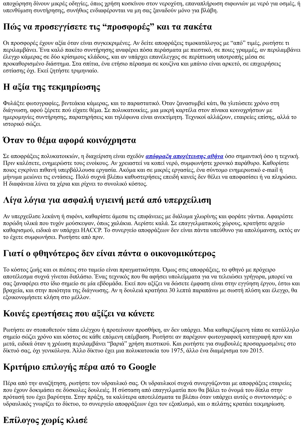αποχώρηση δίνουν μικρές οδηγίες, όπως χρήση κοσκίνου στον νεροχύτη, επαναπλήρωση σιφωνιών με νερό για οσμές, ή υπενθύμιση συντήρησης, συνήθως ενδιαφέρονται να μη σας ξαναδούν μόνο για βλάβη. Πώς να προσεγγίσετε τις “προσφορές” και τα πακέτα Οι προσφορές έχουν αξία όταν είναι συγκεκριμένες. Αν δείτε αποφράξεις τιμοκατάλογος με “από” τιμές, ρωτήστε τι περιλαμβάνει. Ένα καλό πακέτο συντήρησης αναφέρει πόσα περάσματα με πιεστικό, σε ποιες γραμμές, αν περιλαμβάνει έλεγχο κάμερας σε δύο κρίσιμους κλάδους, και αν υπάρχει επανέλεγχος σε περίπτωση υποτροπής μέσα σε προκαθορισμένο διάστημα. Στα σπίτια, ένα ετήσιο πέρασμα σε κουζίνα και μπάνιο είναι αρκετό, σε επιχειρήσεις εστίασης όχι. Εκεί ζητήστε τριμηνιαίο. Η αξία της τεκμηρίωσης Φυλάξτε φωτογραφίες, βιντεάκια κάμερας, και το παραστατικό. Όταν ξανασυμβεί κάτι, θα γλιτώσετε χρόνο στη διάγνωση, αφού ξέρετε πού είχατε θέμα. Σε πολυκατοικίες, μια μικρή καρτέλα στον πίνακα κοινοχρήστων με ημερομηνίες συντήρησης, παρατηρήσεις και τηλέφωνα είναι ανεκτίμητη. Τεχνικοί αλλάζουν, εταιρείες επίσης, αλλά το ιστορικό σώζει. Όταν το θέμα αφορά κοινόχρηστα Σε αποφράξεις πολυκατοικιών, η διαχείριση είναι σχεδόν απόφραξη αποχέτευσης αθήνα όσο σημαντική όσο η τεχνική. Πριν καλέσετε, ενημερώστε τους ενοίκους. Αν χρειαστεί να κοπεί νερό, συμφωνήστε χρονικό παράθυρο. Καθορίστε ποιος εγκρίνει πιθανή υπερβάλλουσα εργασία. Ακόμα και σε μικρές εργασίες, ένα σύντομο ενημερωτικό e-mail ή μήνυμα μειώνει τις εντάσεις. Πολύ συχνά βλέπω καθυστερήσεις επειδή κανείς δεν θέλει να αποφασίσει ή να πληρώσει. Η διαφάνεια λύνει τα χέρια και ρίχνει το συνολικό κόστος. Λίγα λόγια για ασφαλή υγιεινή μετά από υπερχείλιση Αν υπερχείλισε λεκάνη ή σιφόνι, καθαρίστε άμεσα τις επιφάνειες με διάλυμα χλωρίνης και φοράτε γάντια. Αφαιρέστε πορώδη υλικά που τυχόν μούσκεψαν, όπως χαλάκια. Αερίστε καλά. Σε επαγγελματικούς χώρους, κρατήστε αρχείο καθαρισμού, ειδικά αν υπάρχει HACCP. Το συνεργείο αποφράξεων δεν είναι πάντα υπεύθυνο για απολύμανση, εκτός αν το έχετε συμφωνήσει. Ρωτήστε από πριν. Γιατί ο φθηνότερος δεν είναι πάντα ο οικονομικότερος Το κόστος ζωής και οι πιέσεις στο ταμείο είναι πραγματικότητα. Όμως στις αποφράξεις, το φθηνό με πρόχειρο αποτέλεσμα συχνά γίνεται διπλάσιο. Ένας τεχνικός που θα αφήσει υπολείμματα για να τελειώσει γρήγορα, μπορεί να σας ξαναφέρει στο ίδιο σημείο σε μία εβδομάδα. Εκεί που αξίζει να δώσετε έμφαση είναι στην εγγύηση έργου, έστω και βραχεία, και στην ποιότητα της διάγνωσης. Αν η δουλειά κρατήσει 30 λεπτά παραπάνω με σωστή πλύση και έλεγχο, θα εξοικονομήσετε κλήση στο μέλλον. Κοινές ερωτήσεις που αξίζει να κάνετε Ρωτήστε αν στοποθετούν τάπα ελέγχου ή προτείνουν προσθήκη, αν δεν υπάρχει. Μια καθαριζόμενη τάπα σε κατάλληλο σημείο σώζει χρόνο και κόστος σε κάθε επόμενη επέμβαση. Ρωτήστε αν παρέχουν φωτογραφική καταγραφή πριν και μετά, ειδικά όταν η χρέωση περιλαμβάνει “βαριά” χρήση πιεστικού. Και ρωτήστε για συμβουλές προσαρμοσμένες στο δίκτυό σας, όχι γενικόλογα. Άλλο δίκτυο έχει μια πολυκατοικία του 1975, άλλο ένα διαμέρισμα του 2015. Κριτήριο επιλογής πέρα από το Google Πέρα από την αναζήτηση, ρωτήστε τον υδραυλικό σας. Οι υδραυλικοί συχνά συνεργάζονται με αποφράξεις εταιρείες που έχουν δοκιμάσει σε δύσκολες δουλειές. Η σύσταση από επαγγελματία που θα βάλει το όνομά του δίπλα στην πρότασή του έχει βαρύ