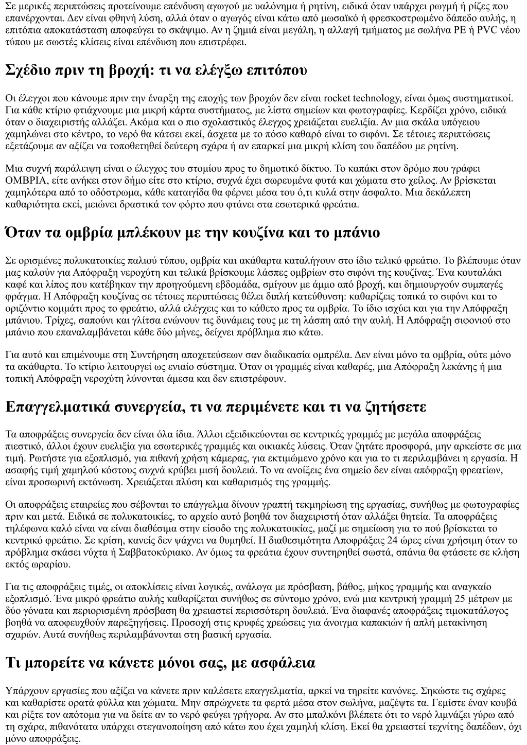 Σε μερικές περιπτώσεις προτείνουμε επένδυση αγωγού με υαλόνημα ή ρητίνη, ειδικά όταν υπάρχει ρωγμή ή ρίζες που επανέρχονται. Δεν είναι φθηνή λύση, αλλά όταν ο αγωγός είναι κάτω από μωσαϊκό ή φρεσκοστρωμένο δάπεδο αυλής, η επιτόπια αποκατάσταση αποφεύγει το σκάψιμο. Αν η ζημιά είναι μεγάλη, η αλλαγή τμήματος με σωλήνα PE ή PVC νέου τύπου με σωστές κλίσεις είναι επένδυση που επιστρέφει. Σχέδιο πριν τη βροχή: τι να ελέγξω επιτόπου Οι έλεγχοι που κάνουμε πριν την έναρξη της εποχής των βροχών δεν είναι rocket technology, είναι όμως συστηματικοί. Για κάθε κτίριο φτιάχνουμε μια μικρή κάρτα συστήματος, με λίστα σημείων και φωτογραφίες. Κερδίζει χρόνο, ειδικά όταν ο διαχειριστής αλλάζει. Ακόμα και ο πιο σχολαστικός έλεγχος χρειάζεται ευελιξία. Αν μια σκάλα υπόγειου χαμηλώνει στο κέντρο, το νερό θα κάτσει εκεί, άσχετα με το πόσο καθαρό είναι το σιφόνι. Σε τέτοιες περιπτώσεις εξετάζουμε αν αξίζει να τοποθετηθεί δεύτερη σχάρα ή αν επαρκεί μια μικρή κλίση του δαπέδου με ρητίνη. Μια συχνή παράλειψη είναι ο έλεγχος του στομίου προς το δημοτικό δίκτυο. Το καπάκι στον δρόμο που γράφει ΟΜΒΡΙΑ, είτε ανήκει στον δήμο είτε στο κτίριο, συχνά έχει σωρευμένα φυτά και χώματα στο χείλος. Αν βρίσκεται χαμηλότερα από το οδόστρωμα, κάθε καταιγίδα θα φέρνει μέσα του ό,τι κυλά στην άσφαλτο. Μια δεκάλεπτη καθαριότητα εκεί, μειώνει δραστικά τον φόρτο που φτάνει στα εσωτερικά φρεάτια. Όταν τα ομβρία μπλέκουν με την κουζίνα και το μπάνιο Σε ορισμένες πολυκατοικίες παλιού τύπου, ομβρία και ακάθαρτα καταλήγουν στο ίδιο τελικό φρεάτιο. Το βλέπουμε όταν μας καλούν για Απόφραξη νεροχύτη και τελικά βρίσκουμε λάσπες ομβρίων στο σιφόνι της κουζίνας. Ένα κουταλάκι καφέ και λίπος που κατέβηκαν την προηγούμενη εβδομάδα, σμίγουν με άμμο από βροχή, και δημιουργούν συμπαγές φράγμα. Η Απόφραξη κουζίνας σε τέτοιες περιπτώσεις θέλει διπλή κατεύθυνση: καθαρίζεις τοπικά το σιφόνι και το οριζόντιο κομμάτι προς το φρεάτιο, αλλά ελέγχεις και το κάθετο προς τα ομβρία. Το ίδιο ισχύει και για την Απόφραξη μπάνιου. Τρίχες, σαπούνι και γλίτσα ενώνουν τις δυνάμεις τους με τη λάσπη από την αυλή. Η Απόφραξη σιφονιού στο μπάνιο που επαναλαμβάνεται κάθε δύο μήνες, δείχνει πρόβλημα πιο κάτω. Για αυτό και επιμένουμε στη Συντήρηση αποχετεύσεων σαν διαδικασία ομπρέλα. Δεν είναι μόνο τα ομβρία, ούτε μόνο τα ακάθαρτα. Το κτίριο λειτουργεί ως ενιαίο σύστημα. Όταν οι γραμμές είναι καθαρές, μια Απόφραξη λεκάνης ή μια τοπική Απόφραξη νεροχύτη λύνονται άμεσα και δεν επιστρέφουν. Επαγγελματικά συνεργεία, τι να περιμένετε και τι να ζητήσετε Τα αποφράξεις συνεργεία δεν είναι όλα ίδια. Άλλοι εξειδικεύονται σε κεντρικές γραμμές με μεγάλα αποφράξεις πιεστικό, άλλοι έχουν ευελιξία για εσωτερικές γραμμές και οικιακές λύσεις. Όταν ζητάτε προσφορά, μην αρκείστε σε μια τιμή. Ρωτήστε για εξοπλισμό, για πιθανή χρήση κάμερας, για εκτιμώμενο χρόνο και για το τι περιλαμβάνει η εργασία. Η ασαφής τιμή χαμηλού κόστους συχνά κρύβει μισή δουλειά. Το να ανοίξεις ένα σημείο δεν είναι απόφραξη φρεατίων, είναι προσωρινή εκτόνωση. Χρειάζεται πλύση και καθαρισμός της γραμμής. Οι αποφράξεις εταιρείες που σέβονται το επάγγελμα δίνουν γραπτή τεκμηρίωση της εργασίας, συνήθως με φωτογραφίες πριν και μετά. Ειδικά σε πολυκατοικίες, το αρχείο αυτό βοηθά τον διαχειριστή όταν αλλάξει θητεία. Τα αποφράξεις τηλέφωνα καλό είναι να είναι διαθέσιμα στην εί