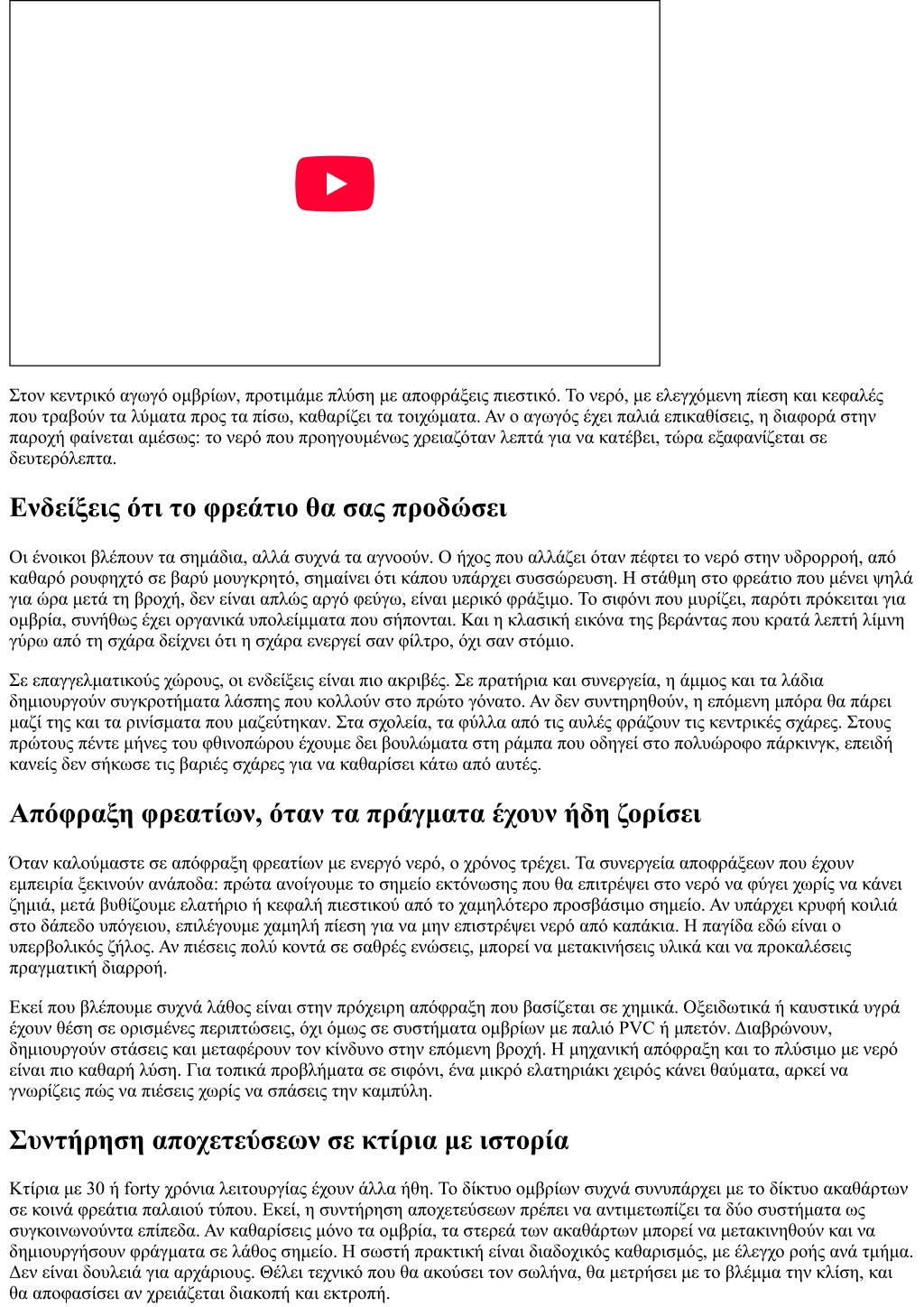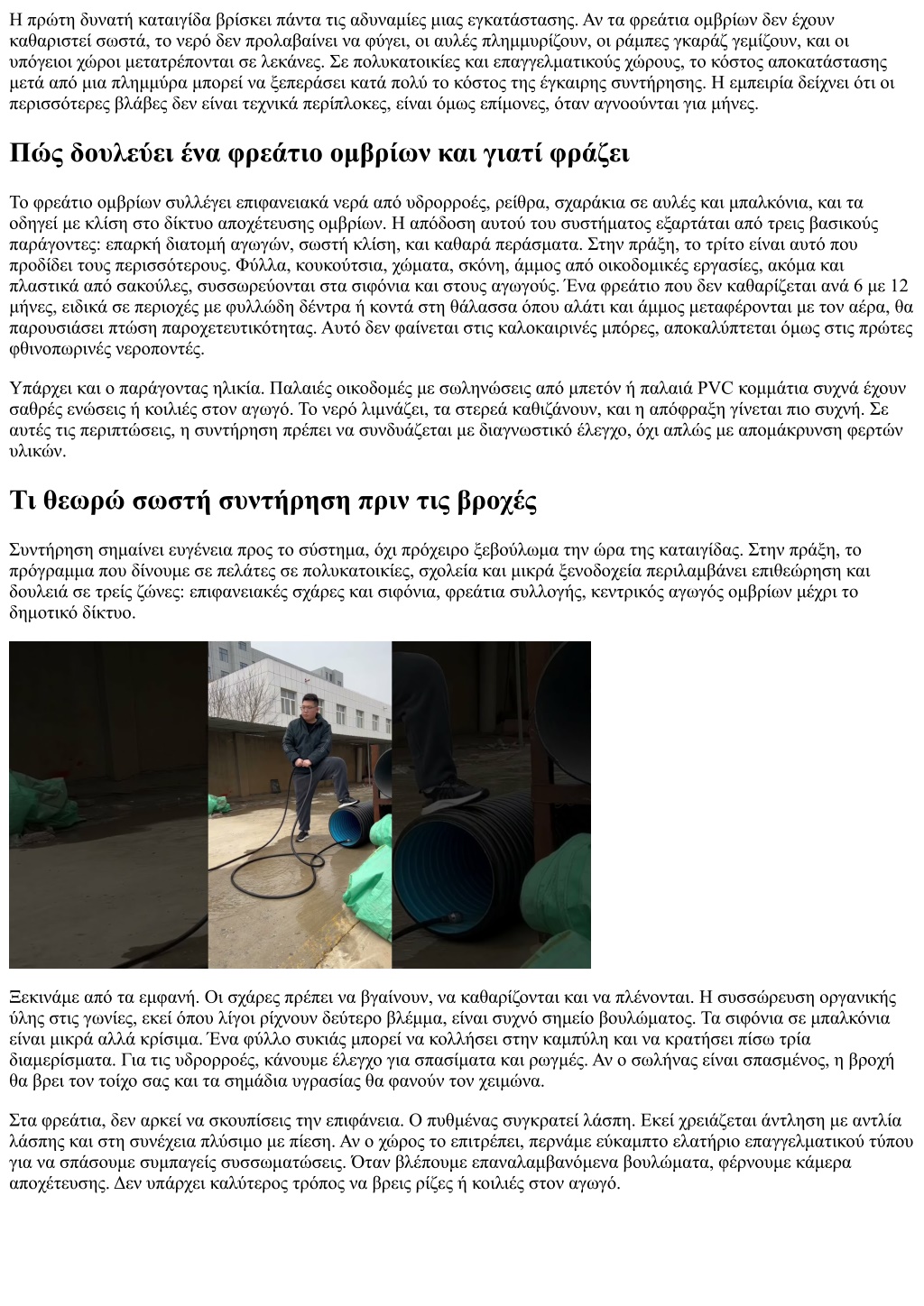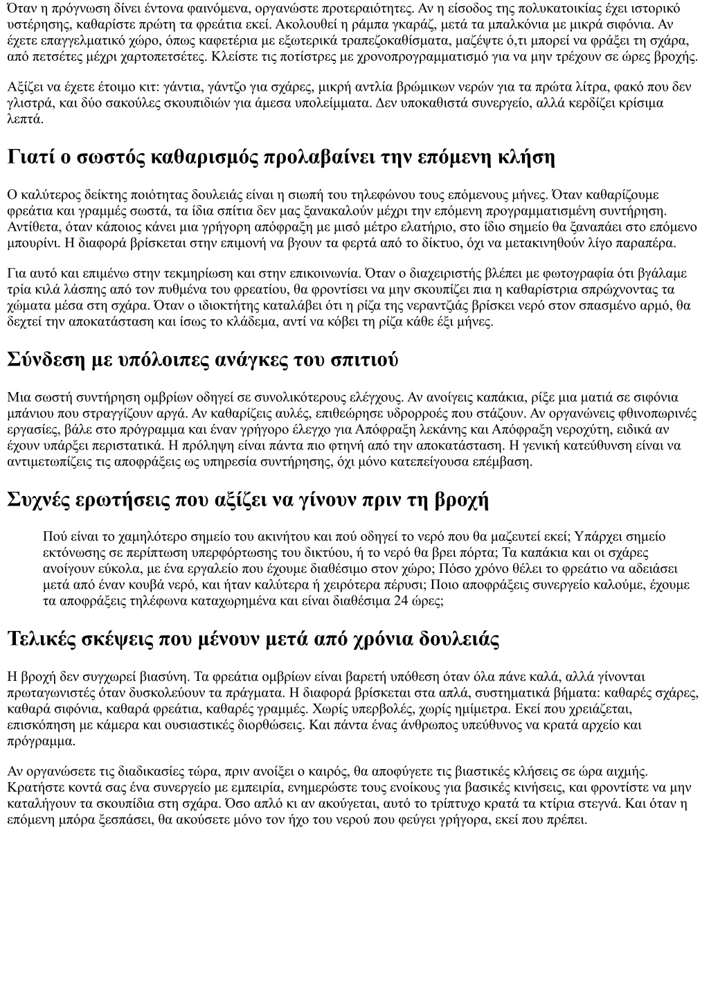 Όταν η πρόγνωση δίνει έντονα φαινόμενα, οργανώστε προτεραιότητες. Αν η είσοδος της πολυκατοικίας έχει ιστορικό υστέρησης, καθαρίστε πρώτη τα φρεάτια εκεί. Ακολουθεί η ράμπα γκαράζ, μετά τα μπαλκόνια με μικρά σιφόνια. Αν έχετε επαγγελματικό χώρο, όπως καφετέρια με εξωτερικά τραπεζοκαθίσματα, μαζέψτε ό,τι μπορεί να φράξει τη σχάρα, από πετσέτες μέχρι χαρτοπετσέτες. Κλείστε τις ποτίστρες με χρονοπρογραμματισμό για να μην τρέχουν σε ώρες βροχής. Αξίζει να έχετε έτοιμο κιτ: γάντια, γάντζο για σχάρες, μικρή αντλία βρώμικων νερών για τα πρώτα λίτρα, φακό που δεν γλιστρά, και δύο σακούλες σκουπιδιών για άμεσα υπολείμματα. Δεν υποκαθιστά συνεργείο, αλλά κερδίζει κρίσιμα λεπτά. Γιατί ο σωστός καθαρισμός προλαβαίνει την επόμενη κλήση Ο καλύτερος δείκτης ποιότητας δουλειάς είναι η σιωπή του τηλεφώνου τους επόμενους μήνες. Όταν καθαρίζουμε φρεάτια και γραμμές σωστά, τα ίδια σπίτια δεν μας ξανακαλούν μέχρι την επόμενη προγραμματισμένη συντήρηση. Αντίθετα, όταν κάποιος κάνει μια γρήγορη απόφραξη με μισό μέτρο ελατήριο, στο ίδιο σημείο θα ξαναπάει στο επόμενο μπουρίνι. Η διαφορά βρίσκεται στην επιμονή να βγουν τα φερτά από το δίκτυο, όχι να μετακινηθούν λίγο παραπέρα. Για αυτό και επιμένω στην τεκμηρίωση και στην επικοινωνία. Όταν ο διαχειριστής βλέπει με φωτογραφία ότι βγάλαμε τρία κιλά λάσπης από τον πυθμένα του φρεατίου, θα φροντίσει να μην σκουπίζει πια η καθαρίστρια σπρώχνοντας τα χώματα μέσα στη σχάρα. Όταν ο ιδιοκτήτης καταλάβει ότι η ρίζα της νεραντζιάς βρίσκει νερό στον σπασμένο αρμό, θα δεχτεί την αποκατάσταση και ίσως το κλάδεμα, αντί να κόβει τη ρίζα κάθε έξι μήνες. Σύνδεση με υπόλοιπες ανάγκες του σπιτιού Μια σωστή συντήρηση ομβρίων οδηγεί σε συνολικότερους ελέγχους. Αν ανοίγεις καπάκια, ρίξε μια ματιά σε σιφόνια μπάνιου που στραγγίζουν αργά. Αν καθαρίζεις αυλές, επιθεώρησε υδρορροές που στάζουν. Αν οργανώνεις φθινοπωρινές εργασίες, βάλε στο πρόγραμμα και έναν γρήγορο έλεγχο για Απόφραξη λεκάνης και Απόφραξη νεροχύτη, ειδικά αν έχουν υπάρξει περιστατικά. Η πρόληψη είναι πάντα πιο φτηνή από την αποκατάσταση. Η γενική κατεύθυνση είναι να αντιμετωπίζεις τις αποφράξεις ως υπηρεσία συντήρησης, όχι μόνο κατεπείγουσα επέμβαση. Συχνές ερωτήσεις που αξίζει να γίνουν πριν τη βροχή Πού είναι το χαμηλότερο σημείο του ακινήτου και πού οδηγεί το νερό που θα μαζευτεί εκεί; Υπάρχει σημείο εκτόνωσης σε περίπτωση υπερφόρτωσης του δικτύου, ή το νερό θα βρει πόρτα; Τα καπάκια και οι σχάρες ανοίγουν εύκολα, με ένα εργαλείο που έχουμε διαθέσιμο στον χώρο; Πόσο χρόνο θέλει το φρεάτιο να αδειάσει μετά από έναν κουβά νερό, και ήταν καλύτερα ή χειρότερα πέρυσι; Ποιο αποφράξεις συνεργείο καλούμε, έχουμε τα αποφράξεις τηλέφωνα καταχωρημένα και είναι διαθέσιμα 24 ώρες; Τελικές σκέψεις που μένουν μετά από χρόνια δουλειάς Η βροχή δεν συγχωρεί βιασύνη. Τα φρεάτια ομβρίων είναι βαρετή υπόθεση όταν όλα πάνε καλά, αλλά γίνονται πρωταγωνιστές όταν δυσκολεύουν τα πράγματα. Η διαφορά βρίσκεται στα απλά, συστηματικά βήματα: καθαρές σχάρες, καθαρά σιφόνια, καθαρά φρεάτια, καθαρές γραμμές. Χωρίς υπερβολές, χωρίς ημίμετρα. Εκεί που χρειάζεται, επισκόπηση με κάμερα και ουσιαστικές διορθώσεις. Και πάντα ένας άνθρωπος υπεύθυνος να κρατά αρχείο και πρόγραμμα. Αν οργανώσετε τις διαδικασίες τώρα, πριν ανοίξει ο καιρός, θα αποφύγετε τις βιαστικές κλήσεις σε ώρα αιχμής. Κρατ